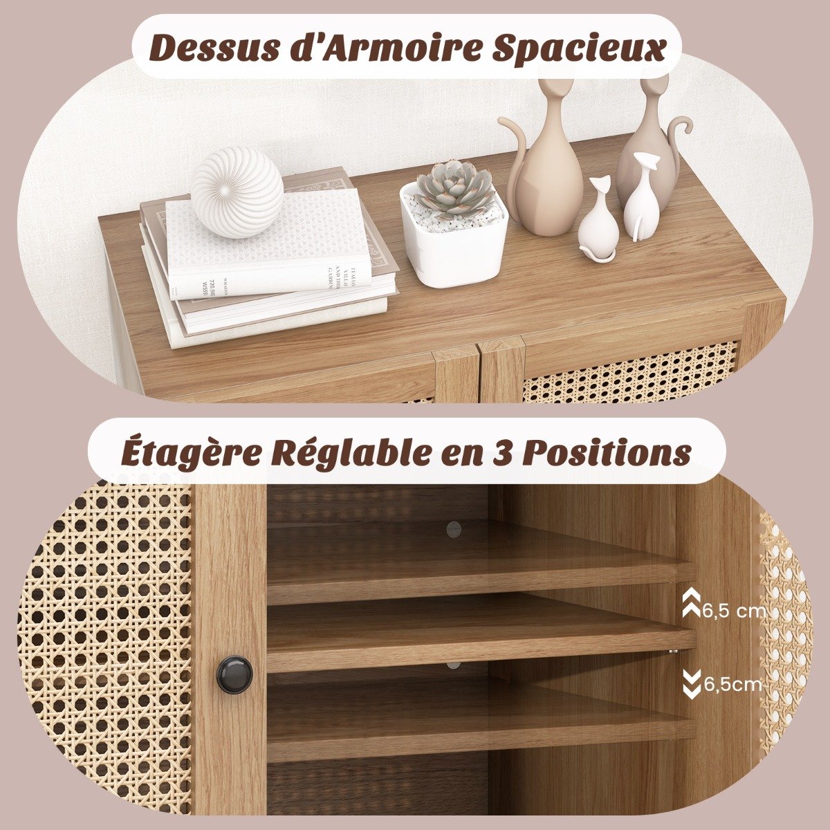 Nosso aparador possui um tampo espaçoso e 2 compartimentos internos, perfeitos para sua cafeteira, xícaras e utensílios. A alça conveniente e as dobradiças de metal facilitam o acesso e as prateleiras ajustáveis ​​podem armazenar itens de diferentes tamanhos. O rattan é durável, resistente e não desbota facilmente. Os pés de metal antiderrapantes elevados são práticos e permitem uma capacidade de peso de até 125 kg. As portas de rattan o tornam um armazenamento elegante que pode ser usado como aparador, armário de cozinha, armário de entrada ou no escritório. Atributos: 【Espaço de armazenamento suficiente】O tampo da mesa amplo oferece bastante espaço para cafeteiras ou xícaras usadas com frequência. E há 2 grandes compartimentos de armazenamento internos para armazenar talheres. A prateleira pode ser ajustada em 3 posições, permitindo que você armazene itens de diferentes tamanhos. 【Guarda-roupa de rattan anti-inclinação】Nosso guarda-roupa possui portas de rattan, que trazem um charme elegante e garantem boa respirabilidade. As tábuas grossas e o dispositivo anti-inclinação garantem uma estrutura confiável. O guarda-roupa pode suportar uma carga total de até 125 kg. 【Pés de suporte de metal elevados】Este aparador é equipado com 4 pés de suporte de metal elevados, que fornecem excelente suporte enquanto permitem que você limpe facilmente o espaço sob o armário. Além disso, os pés antiderrapantes podem proteger seu piso de arranhões. 【Adequado para vários cômodos】Nosso armário pode ser usado como aparador e também como armário de armazenamento de cozinha. Graças à sua altura moderada, você também pode colocá-lo em seu hall de entrada para usá-lo como um armário de entrada ou em sua sala de estar como um armário de armazenamento independente. 【Fácil de montar】As dimensões do armário de entrada são: 80 cm x 40 cm x 80 cm (C x L x A). Ele vem com instruções detalhadas para que você possa montá-lo rapidamente. Não há dúvida de que este elegante aparador de meados do século iluminará seu espaço interior.