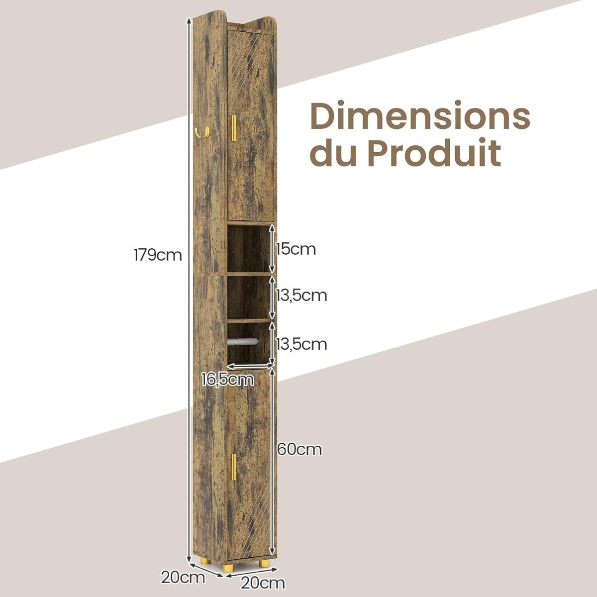 Armário de banheiro alto e estreito com 2 portas, prateleiras ajustáveis, porta-papel higiênico e gancho lateral. Cor: Café.