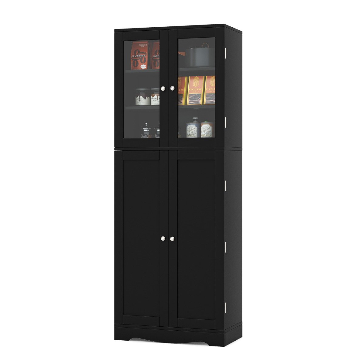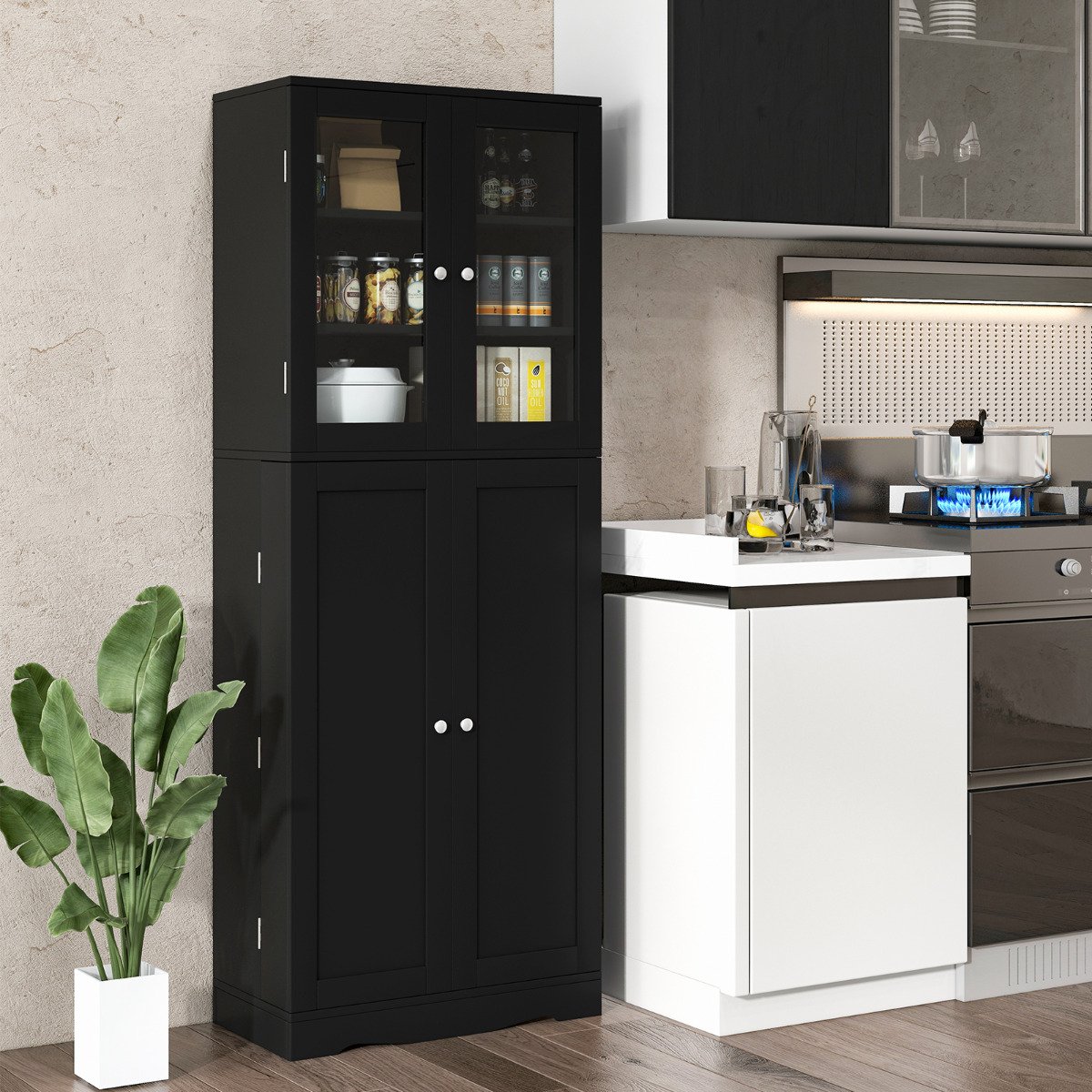 Armário de cozinha alto de madeira com 2 portas de vidro temperado e prateleiras, na cor preta.