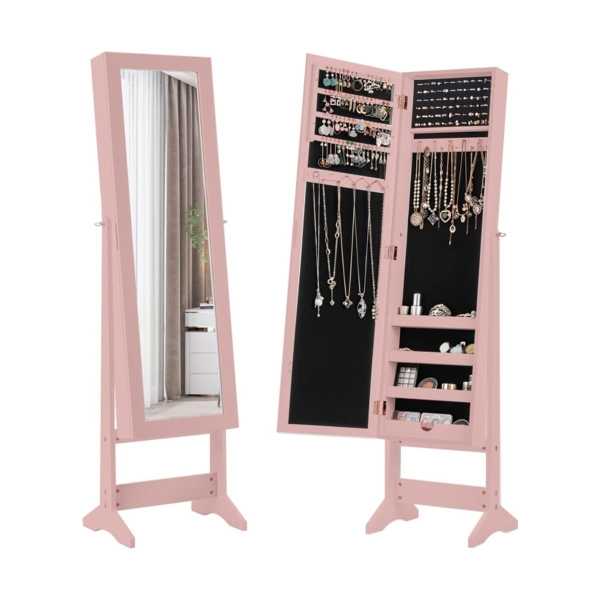 Você já pensou em combinar um espelho com um armário de joias? Nosso armário de joias 2 em 1 é o companheiro perfeito para qualquer mulher com uma grande coleção de joias. O armário de joias foi projetado com 64 compartimentos para brincos e 44 furos para brincos, 72 compartimentos para anéis, 20 ganchos para colar e 4 prateleiras de armazenamento. O espaço de armazenamento compartimentado de grande capacidade permite que você armazene todas as suas coleções no armário. O armário é feito de MDF premium para garantir uso duradouro. Além disso, um espelho de corpo inteiro que pode ser ajustado em 3 ângulos oferece uma visão completa quando você está se vestindo. Graças ao seu design elegante, ele pode se encaixar perfeitamente em qualquer decoração de interiores. Atributos: 【Armário e Espelho 2 em 1】Combinando um espelho e um armário de joias em uma única peça de mobiliário, este armário de joias permite que você aproveite ambos e o prazer de se vestir. Você pode usar o espelho ou o prático armário de joias para guardar suas joias valiosas, criando um espaço organizado e organizado para você. 【Grande espaço de armazenamento compartimentado】O armário de joias foi projetado com 4 prateleiras forradas que incluem 64 compartimentos para brincos e 44 furos, 72 compartimentos para anéis, 20 ganchos para colar e 4 prateleiras para cosméticos. Os espaços de armazenamento particionados manterão todas as suas joias perfeitamente alinhadas. 【Materiais selecionados e estrutura estável】Feito de MDF de qualidade e com uma estrutura sólida, este armário de joias é resistente e durável para uso a longo prazo. A base triangular garante boa estabilidade para evitar tombamento. Almofadas antiderrapantes ajudam o armário a aderir ao chão e protegê-lo de arranhões. 【Espelho de pé inclinável em 3 ângulos】Você pode escolher entre 3 níveis de inclinação que permitem encontrar a posição mais confortável de acordo com sua altura. Você pode girar o espelho livremente e fixar a posição usando os furos horizontais fornecidos para essa finalidade. O espelho retangular é perfeito em largura e altura para ver claramente sua figura. 【Proteção Extra】O forro protetor de tecido preto ajuda a evitar que suas joias sejam arranhadas e arranhadas. O dispositivo magnético mantém seus tesouros em um espaço fechado para maior segurança. Com seu design fino e estilo elegante, o armário de joias super funcional é perfeito para quarto, banheiro, camarim, etc. Características: Feito de MDF de qualidade para garantir a resistência e a longevidade do produto Estrutura grossa e pernas triangulares para melhor estabilidade Espelho de corpo inteiro para uma visão completa 4 prateleiras forradas com 64 compartimentos e 44 furos para brincos 20 ganchos espaçados para evitar que os colares se enrosquem 72 compartimentos para anéis para mantê-los organizados. 4 prateleiras para armazenar cosméticos Um forro interno macio protege suas joias de arranhões Uma rolha magnética para manter suas joias em um espaço seguro e fechado Uma aparência sóbria e elegante, perfeita para a decoração da sua casa