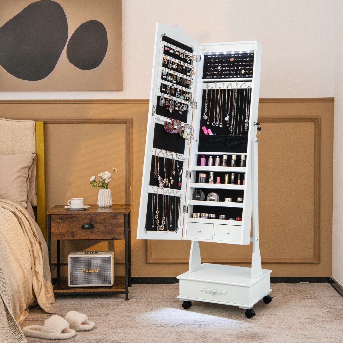 Armário de joias de chão com rodinhas, espelho, fechadura e gavetas – Branco