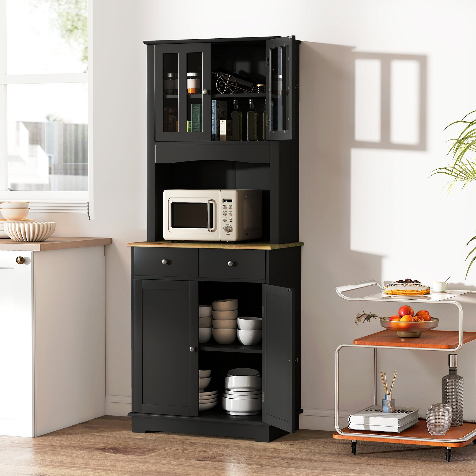 Nosso moderno armário de despensa trará elegância ao seu espaço de vida, mantendo as coisas organizadas. Construído com painéis de madeira de alta qualidade e vidro temperado, este armário de despensa de cozinha é altamente durável e estável. A superfície laqueada é lisa e resistente à água, facilitando a limpeza com um pano úmido. Equipado com duas gavetas e dois armários fechados, este aparador oferece amplo espaço de armazenamento. A prateleira interna pode ser ajustada em três alturas para acomodar itens de diferentes alturas. Você pode colocar um micro-ondas, torradeira ou outros pequenos eletrodomésticos na prateleira central para fácil acesso. Este armário, com seu design simples e moderno, combina perfeitamente com vários estilos de decoração. Observação: há furos pré-perfurados na parte superior do painel traseiro. Você pode comprar e instalar um dispositivo anti-tombamento para evitar tombamento. Atributos: Espaço de armazenamento fechado e aberto: O armário de armazenamento possui uma prateleira central aberta para o micro-ondas e duas gavetas compactas para utensílios de mesa. O aparador buffet também possui dois armários fechados com prateleiras ajustáveis no interior, proporcionando amplo espaço para vários itens de alturas variadas. Material durável e Estrutura Estável: Construído em MDF durável, compensado e madeira de seringueira maciça, este armário de despensa de cozinha garante alta estabilidade e durabilidade para uso a longo prazo. A base robusta aumenta a estabilidade e garante um uso confiável e seguro. Design seguro e fácil de usar: As alças redondas requintadas e o fecho magnético permitem fácil abertura e fechamento das portas. O armário também possui um orifício para cabos para manter os cabos bagunçados em ordem. As portas de vidro visíveis facilitam a identificação da localização dos itens e também são resistentes à quebra. Design Moderno e Uso Versátil: Este armário é uma combinação perfeita de design simples e charme moderno, combinando bem com qualquer estilo de design de interiores. Com excelente praticidade, este armário versátil pode ser usado não apenas como um aparador de cozinha, mas também como uma mesa de banheiro ou estante na sala de estar. Fácil de montar e manter: Equipado com todas as peças, ferragens e instruções detalhadas necessárias, este armário de despensa é fácil de montar. Você pode concluir o trabalho de montagem em um curto espaço de tempo seguindo as instruções. A manutenção diária também é simples. Basta limpar este armário de despensa com um pano úmido! Características: Estrutura de madeira estável com tinta à prova d’água para uma longa vida útil Amplo espaço de armazenamento para vários utensílios de cozinha Porta superior visível feita de vidro temperado para maior conveniência Piso interno ajustável em 3 direções para diferentes necessidades de armazenamento 2 gavetas grandes com trilhos de metal lisos mantêm os pratos em condições seguras O orifício para gerenciamento de cabos ajuda a organizar bem os cabos bagunçados As portas podem ser facilmente abertas com os botões redondos e o fecho magnético Armário de armazenamento perfeito para cozinha, sala de jantar, sala de estar, etc. O design simples e o estilo moderno combinam bem com qualquer decoração de casa