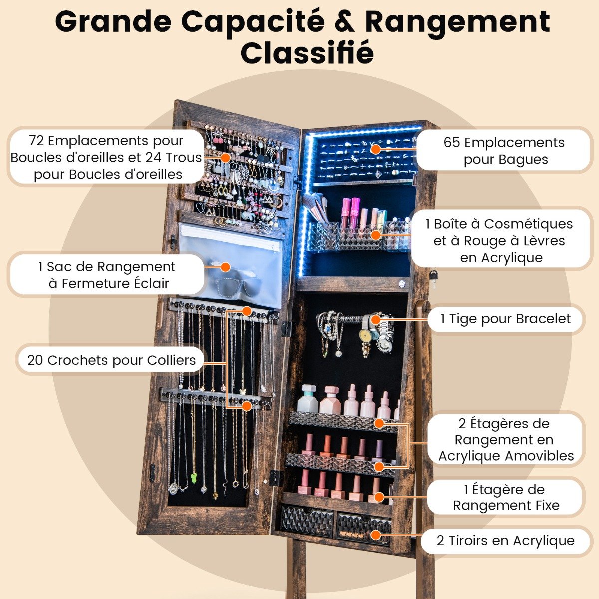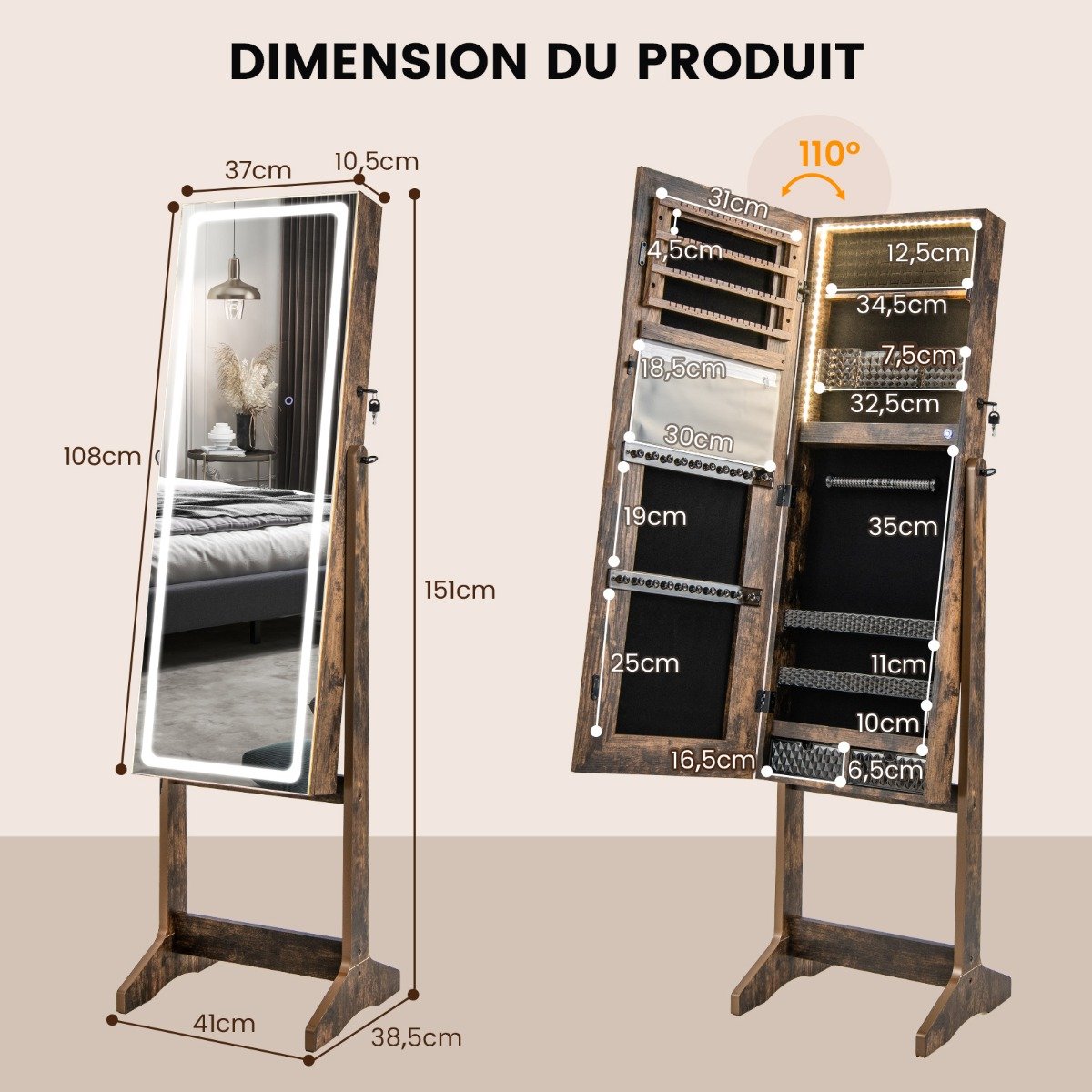 Este armário de joias independente com espelho tornará sua vida muito mais fácil! Este armário de joias pode organizar perfeitamente todas as suas joias. Para manter seus objetos de valor seguros, o armário de joias é equipado com uma porta com fechadura e forro de veludo macio no interior. Particularmente prático é o espelho de corpo inteiro sensível ao toque com iluminação LED de 3 cores, que traz luz para o seu quarto, enquanto as luzes LED de 3 cores integradas facilitam a seleção de joias no escuro. Atributos: Grande capacidade e armazenamento classificado: Este armário de joias possui 72 compartimentos para brincos, 24 furos para brincos, 1 bolso com zíper, 20 ganchos para colar, 65 compartimentos para anéis, 1 caixa de acrílico para cosméticos e batom, 1 haste para pulseira, 2 prateleiras de acrílico removíveis, 1 prateleira de armazenamento fixa e 2 gavetas de acrílico para manter suas joias organizadas e facilmente acessíveis. Iluminação LED externa e interna: O armário de joias de pé possui um espelho de corpo inteiro externo iluminado com 3 temperaturas de cor (branco frio, branco quente, amarelo quente). Além disso, a faixa de LED regulável integrada também tem 3 cores: azul, azul e branco misturado, amarelo. Nota: Conecte o adaptador de energia incluído antes de usar. Design bem feito e atencioso: equipado com uma porta com fechadura e chaves, o armário de joias espelhado mantém cada peça de suas joias segura. Além disso, a alça antiderrapante na parte traseira, a base reforçada e as almofadas antiderrapantes na parte inferior garantem alta estabilidade e segurança. Armário de joias ajustável 2 em 1: este armário de joias autônomo multifuncional com espelho de corpo inteiro pode atender perfeitamente a todas as suas necessidades de vestir e armazenar joias. Além disso, o armário de joias oferece 3 ângulos de inclinação ajustáveis para que você possa encontrar o ângulo mais adequado para você. Presente perfeito para seus entes queridos: com uma combinação de aparência elegante e grande capacidade de armazenamento, este armário de joias com iluminação LED é o presente ideal para sua esposa, mãe ou namorada. Além disso, o corpo do armário é pré-montado para uma configuração sem esforço. Características: Espelho de corpo inteiro com barra de luz LED regulável em 3 cores Luzes LED integradas com 3 cores facilitam a escolha das joias Ajuste fácil de brilho pressionando longamente o interruptor de toque O design com trava mantém seus objetos de valor seguros Almofadas antiderrapantes para os pés fornecem estabilidade e protegem o chão O fechamento magnético mantém o gabinete firmemente fechado Dispositivo antiderrapante para fixação na parede O forro macio protege seus objetos de valor contra arranhões