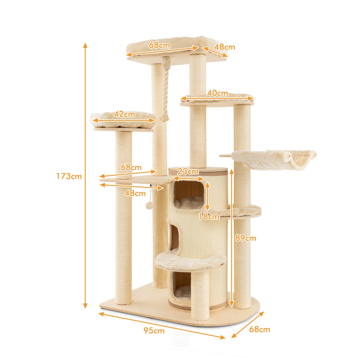 Arranhador de madeira de 173 cm com toca, tapetes, bola e corda suspensa para gatos, bege.