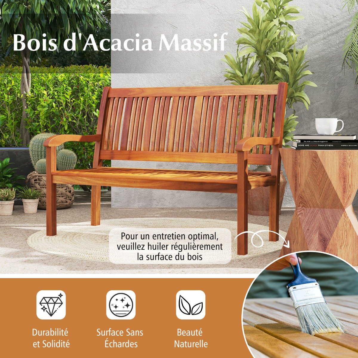 Com sua alta capacidade de carga e bela aparência, este banco de jardim é uma ótima escolha. A fabricação de madeira de acácia de alta qualidade dá ao banco forte estabilidade e robustez para que ele possa ser usado por um longo tempo. O assento espaçoso também oferece espaço para 2 a 3 pessoas, para que você possa sentar-se confortavelmente neste banco e ter longas conversas com seus amigos. O encosto ligeiramente curvado e os amplos apoios de braços tornam o banco extremamente confortável para sentar e relaxar. Com seu design simples e cor natural, este banco decorará idealmente seu terraço, jardim, varanda ou sala de estar, tanto em ambientes internos quanto externos. Características: A madeira de acácia de alta qualidade forma uma estrutura estável e robusta Espaço espaçoso para 2 a 3 pessoas sentarem-se confortavelmente Encosto ligeiramente inclinado e apoios de braços curvos para sentar confortavelmente Apoios de braços largos em uma altura confortável para descansar seus braços e mãos A cor natural de teca dá ao seu quarto uma aparência elegante e exótica Uma bela adição para áreas internas e externas Fácil montagem com a ajuda das instruções de montagem detalhadas