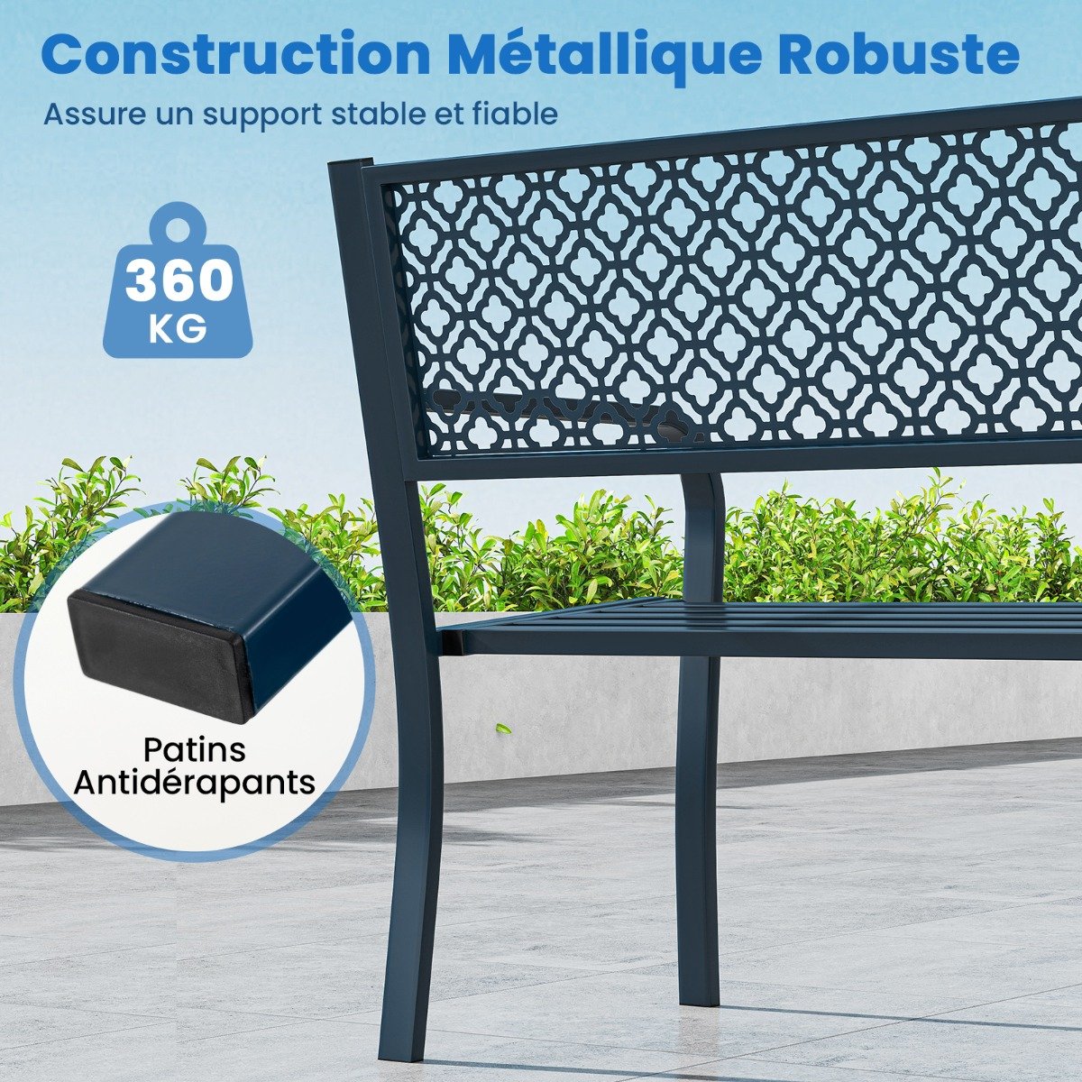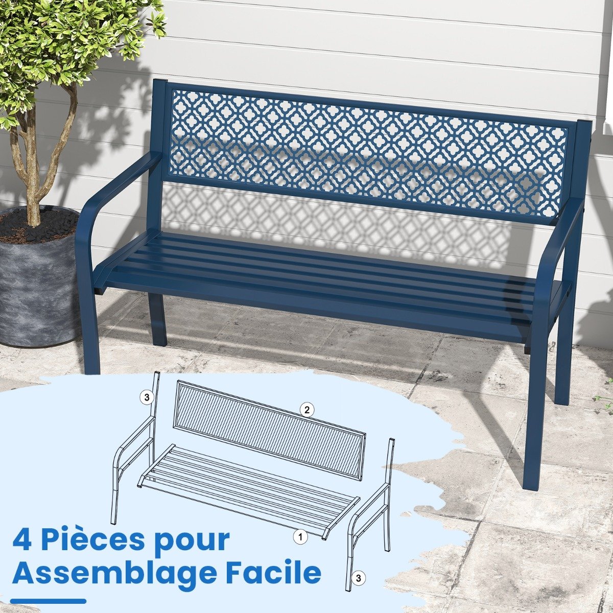 Banco de jardim externo de 126 cm em metal com encosto em treliça geométrica, apoios de braço e assento ripado, azul.