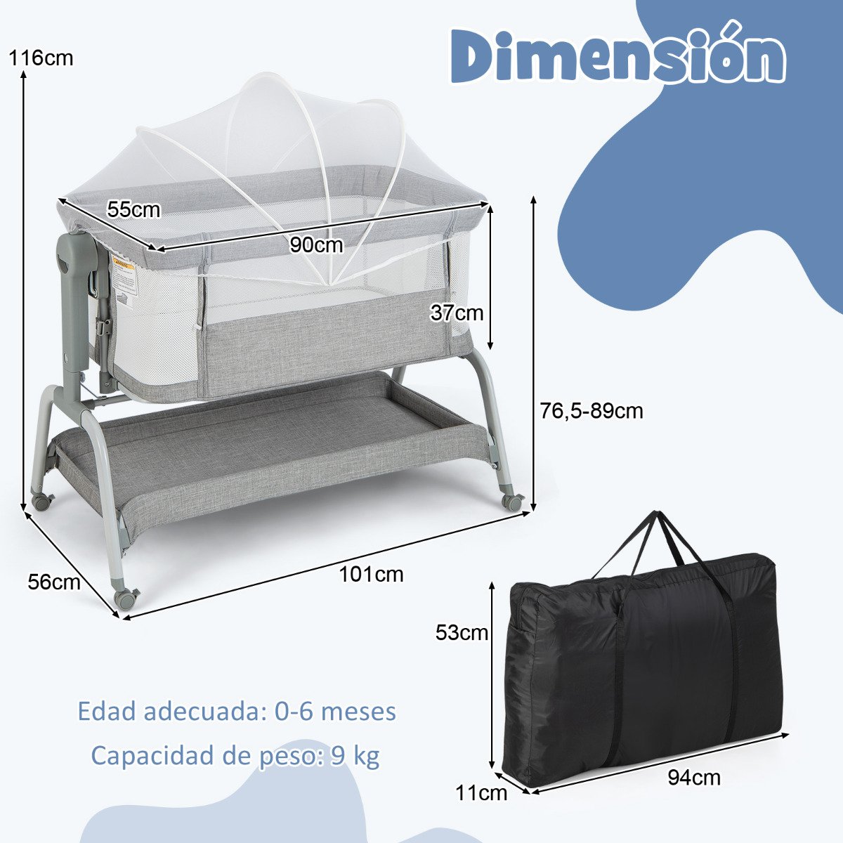 Nosso berço versátil pode ser usado como cama auxiliar, berço independente ou balanço. O mosquiteiro removível oferece uma camada extra de proteção para o seu pequeno. O berço possui um design com quatro lados em tela para ventilação e visibilidade ideais. Com 6 ajustes de altura, o berço se adapta facilmente à maioria das camas. A função de inclinação ajuda a prevenir o refluxo. Equipado com um colchão e um prático compartimento de armazenamento na parte inferior, oferece espaço suficiente para todos os utensílios importantes do bebê. As quatro rodas com trava facilitam a movimentação do berço, proporcionando estabilidade. Para maior conveniência, uma bolsa de transporte está incluída. Pontos principais: Uso prático na cama: Abaixe um dos painéis laterais e prenda o berço à cama com dois elásticos para que os pais possam monitorar e alimentar o bebê com facilidade. Perfeito para bebês de 0 a 6 meses. Design versátil 3 em 1: Este berço pode ser usado não apenas como cama auxiliar, mas também como berço independente e balanço. O suave movimento de balanço ajuda seu filho a adormecer. E o colchão macio oferece ao seu filho uma experiência de sono confortável. Altura e inclinação ajustáveis: Este berço de viagem possui 6 ajustes de altura para se adaptar a diferentes alturas de cama. A função de inclinação ajustável previne o refluxo em bebês. Mosquiteiro e prateleira de armazenamento: Nosso berço está equipado com um mosquiteiro removível e possui um design de tela nos quatro lados para excelente ventilação e visibilidade. A prateleira inferior espaçosa oferece espaço para guardar itens essenciais do bebê. Fácil mobilidade e transporte: Com as quatro rodas com trava na parte inferior, você pode mover e fixar o berço extra sem esforço. A prática bolsa de transporte facilita o transporte do berço quando desmontado. Características: Pode ser acoplado ao lado da cama dos pais para facilitar a amamentação noturna. Design três em um para atender às suas diferentes necessidades. A função de balanço ajuda as crianças a relaxarem e adormecerem rapidamente. Altura facilmente ajustável para combinar com a altura da sua cama. A função de inclinação previne o refluxo do esôfago. Mosquiteiros protegem o bebê de picadas de mosquito. Com quatro rodízios giratórios com trava, fácil de mover e fixar. Colchão macio para maior conforto ao dormir. A prateleira inferior garante que os utensílios do bebê estejam sempre ao alcance. Especificações: Cor: Cinza/Rosa. Material: metal, tecido. Dimensões gerais: 101 x 56 x 116 cm (C x L x A). Dimensões da bolsa de transporte: 94 x 11 x 53 cm (C x L x A). Peso líquido: 9,5 kg. Idade recomendada: 0-6 meses. Capacidade de carga: 9 kg. O pacote inclui: 1 x Berço com mosquiteiro. 1 x Bolsa de transporte. 1 x Manual de instruções.