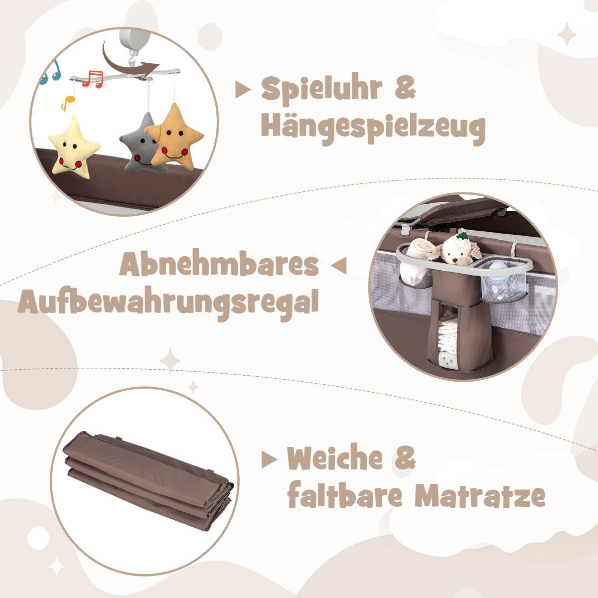 Este berço co-dorminhoco é uma unidade multifuncional que cresce com seu filho desde o nascimento até a primeira infância. O berço multifuncional serve como berço, trocador, berço co-dorminhoco, cercadinho e centro de atividades. Ele vem com cintos de segurança para um co-leito e alimentação perfeitos. O trocador removível e a prateleira de armazenamento garantem cuidados convenientes com o bebê, enquanto a caixa de música e os brinquedos pendurados proporcionam entretenimento relaxante. Ideal para famílias que viajam, este cercadinho portátil dobra-se de forma compacta e vem com uma bolsa de viagem para fácil transporte. Características: Berço, cama extra, trocador, cercadinho e centro de atividades em um só. A grade lateral ajustável em altura se encaixa com segurança na cama dos pais para co-leito. 2 cintos de segurança para fixação na cama dos pais incluídos. A caixa de música e os brinquedos pendurados ajudam a embalar seu bebê para dormir. Armazenamento conveniente graças à prateleira lateral removível. Sono confortável com um colchão macio e dobrável. Feito de malha respirável e tecido Oxford durável. Não são necessárias ferramentas para dobrar e montar. Fácil movimentação e portabilidade com bolsa de transporte e rodas.