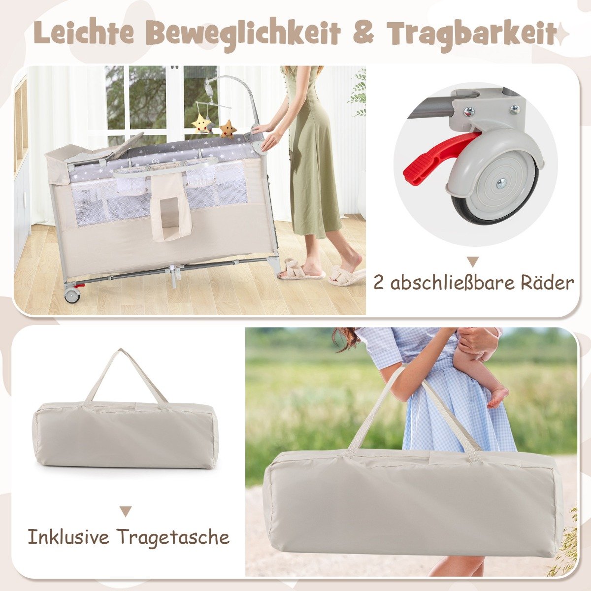 Berço de viagem dobrável com colchão, berço de 2 níveis com rodas marrom