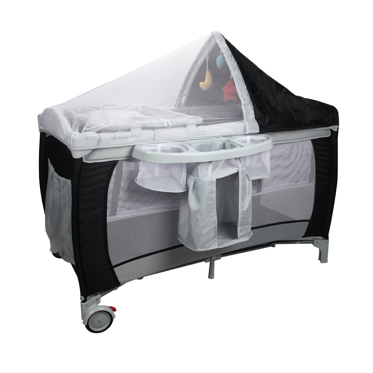 Este cercadinho/berço de viagem é ideal para pernoites com amigos ou familiares. O berço resistente e durável permite cochilos e brincadeiras sem preocupações. Este prático berço oferece um ambiente seguro para o seu bebê dormir ou brincar, podendo ser desmontado quando não estiver em uso. Com um forro extra, podemos oferecer 2 alturas para o seu filho dormir, permitindo que o berço seja usado tanto com bebês bem pequenos quanto com bebês maiores. Também está incluído um trocador removível para as trocas de fraldas mais importantes. Uma prática bolsa de armazenamento removível fica pendurada na lateral, permitindo que você guarde fraldas extras, creme e lenços umedecidos, com espaço para uma mamadeira para a alimentação noturna. Um mosquiteiro e capuz, finalizados com 3 brinquedos macios pendurados para manter seu bebê entretido, completam o item. Montado em segundos com rodas para facilitar a movimentação pelo quarto, não hesite em comprar um! Novo e de alta qualidade Bolsa de transporte conveniente para viagens sem complicações; Mosquiteiro; Duas rodas com freios; Bolsa de armazenamento para pendurar; Trocador fácil de limpar; Seu bebê dorme melhor com a cadeira de balanço do cercadinho; 2 redes laterais longas para ventilação; Fácil de montar e desmontar para transporte e armazenamento; Bolsa de brinquedos conveniente para guardar brinquedos ou uma toca para cachorro para entrar ou sair. Capuz com 3 brinquedos pendurados; Forro extra removível torna este cercadinho adequado para bebês de diferentes idades.