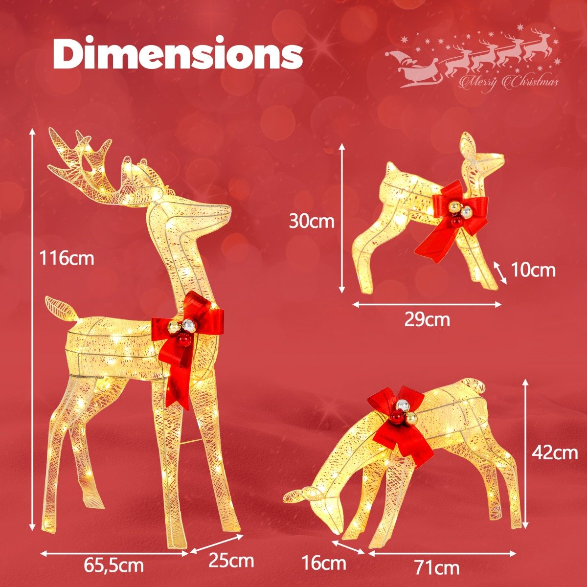Este adorável conjunto inclui um veado, uma corça e um cervo, criando uma decoração de Natal perfeita para um Natal inesquecível. As luzes LED brancas quentes e as luzes piscantes proporcionam uma exibição noturna perfeita, trazendo alegria para sua família e amigos. E você pode instalá-lo no quintal, varanda ou jardim, já que as braçadeiras e as estacas de aterramento sempre manterão a decoração de Natal estável. A estrutura de metal resistente e o algodão durável, bem como o adaptador com temporizador, também prolongam a vida ao ar livre. Atributos: 【Cervo de Natal de 3 peças】Este conjunto familiar de veados de 3 peças consiste em um veado, uma corça e um cervo com detalhes festivos como laços delicados. Como a combinação desses elementos é festiva, coloque esta decoração de Natal em seu quintal para receber amigos com votos calorosos. 【Brilhante e Brilhante】200 luzes brancas quentes brilhantes e 30 luzes piscantes tornam a família, uma decoração deslumbrante à noite para decorar seu espaço. O adaptador com temporizador permite uma operação fácil. Basta conectar e desconectar para ligar e desligar as luzes. 【Materiais duráveis】Feita de estrutura de metal resistente, a decoração de Natal é resistente ao vento, neve e chuva, e pode suportar o teste das condições climáticas. Com algodão durável, uma vida útil mais longa é garantida. 【Acessórios completos e fácil montagem】A decoração é fácil de montar e você só precisa conectar a cabeça, o corpo e a cauda. Cada parte é fixada com braçadeiras para garantir a estabilidade. E há 10 estacas para fixar a decoração no chão. 【Decoração de Natal interna/externa】Este conjunto de família de veados iluminados é uma decoração de Natal atraente em seu quintal, varanda ou jardim. É um presente de Natal ideal para seus amigos e familiares. Tamanho do veado: 25,9 x 10 x 45,7 polegadas, tamanho da corça: 28 x 6,3 x 16,5 polegadas, tamanho do fulvo: 11,4 x 4 x 11,8 polegadas.