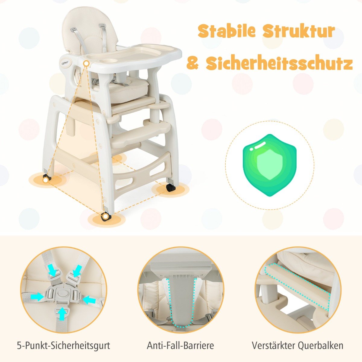 Esta cadeira alta conversível acompanhará o crescimento do seu bebê. Esta cadeira alta pode ser separada em uma cadeira e uma mesa, e a cadeira pode ser convertida em uma cadeira de balanço. A bandeja e as almofadas do assento são removíveis conforme necessário. Além disso, tanto o encosto quanto a bandeja podem ser ajustados em 3 posições para garantir melhor conforto ao sentar. A bandeja de compartimento duplo é adequada para várias aplicações. A bandeja superior com porta-copos e talheres é perfeita para alimentação e alimentação independente. A bandeja é feita de material PP inofensivo. Esta cadeira alta conversível para bebês tem 4 rodas universais e é fácil de mover. Atributos: Cadeira alta conversível 3 em 1: Você pode converter a cadeira em uma cadeira de balanço. Além disso, esta cadeira alta para bebês pode acompanhar o crescimento do seu bebê e pode ser separada em uma cadeira e uma mesa. Assento confortável: O encosto tem 3 ângulos ajustáveis (100 ° / 110 ° / 120 °) que oferecem ao seu bebê uma postura confortável. Além disso, esta cadeira de jantar vem com uma almofada de assento espessa e macia para mais conforto. Bandeja dupla removível: A bandeja pode ser ajustada em 4 posições e você pode removê-la de acordo com suas necessidades. A bandeja dupla é feita de material PP de grau alimentício, não tóxico e lavável na máquina de lavar louça. Proteção de segurança: Esta cadeira de alimentação é construída em uma estrutura piramidal. O cinto de segurança de 5 pontos e o dispositivo anti-tombamento também oferecem segurança adicional. Todos os cantos e bordas são arredondados para proteger seu bebê de arranhões. Fácil de montar e mover: Com instruções detalhadas e acessórios necessários, esta cadeira de bebê é fácil de montar. E 4 rodas universais tornam os movimentos sem esforço, que são destacáveis de acordo com suas necessidades. Características: Também pode ser usada como cadeira de balanço e como conjunto de cadeira e mesa Possui uma bandeja de 4 posições (18 cm/21 cm/24 cm/27 cm) e reclinação de 3 posições (100°/110°/120°) Equipada com bandeja removível e almofada de assento A bandeja tem 2 níveis para diferentes usos A bandeja é feita de material PP fácil de limpar e inofensivo Construída em estrutura piramidal estável Equipada com cinto de 5 pontos e barreira antiqueda Fácil de mover com rodas universais com trava Fácil de montar com instruções incluídas