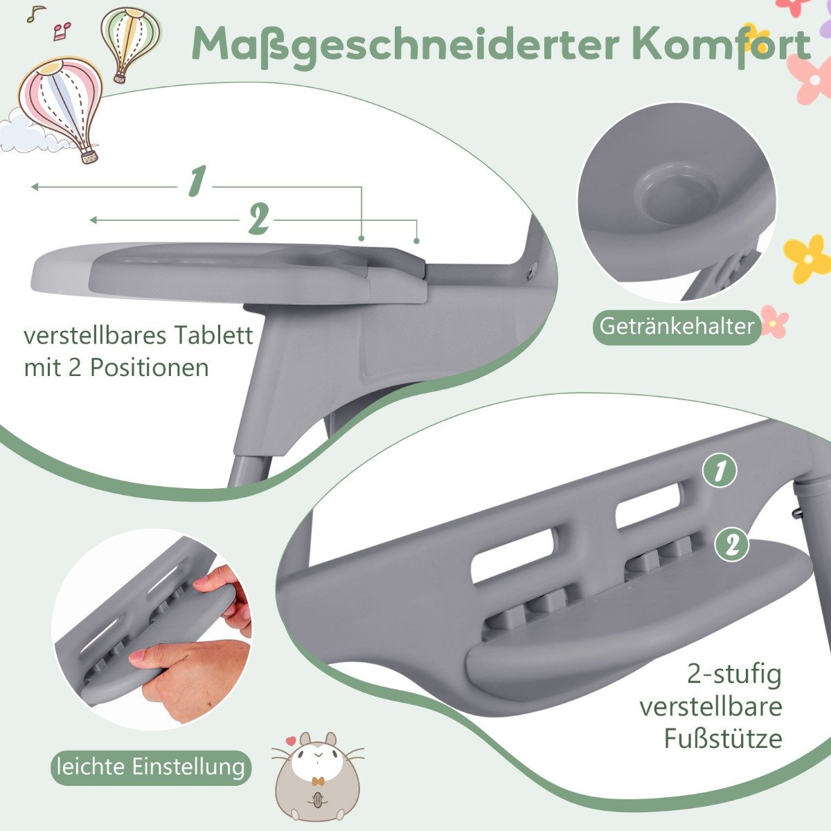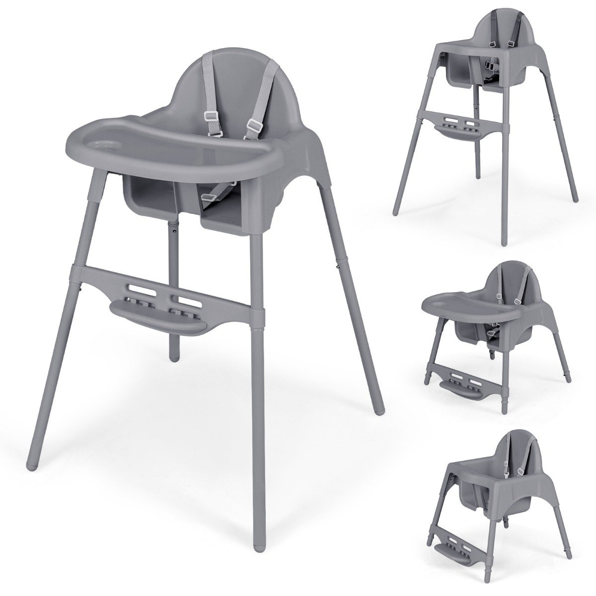 Cadeira alta para bebês e crianças pequenas 4 em 1 conversível com cinto de segurança, bandeja ajustável e removível, cinza.