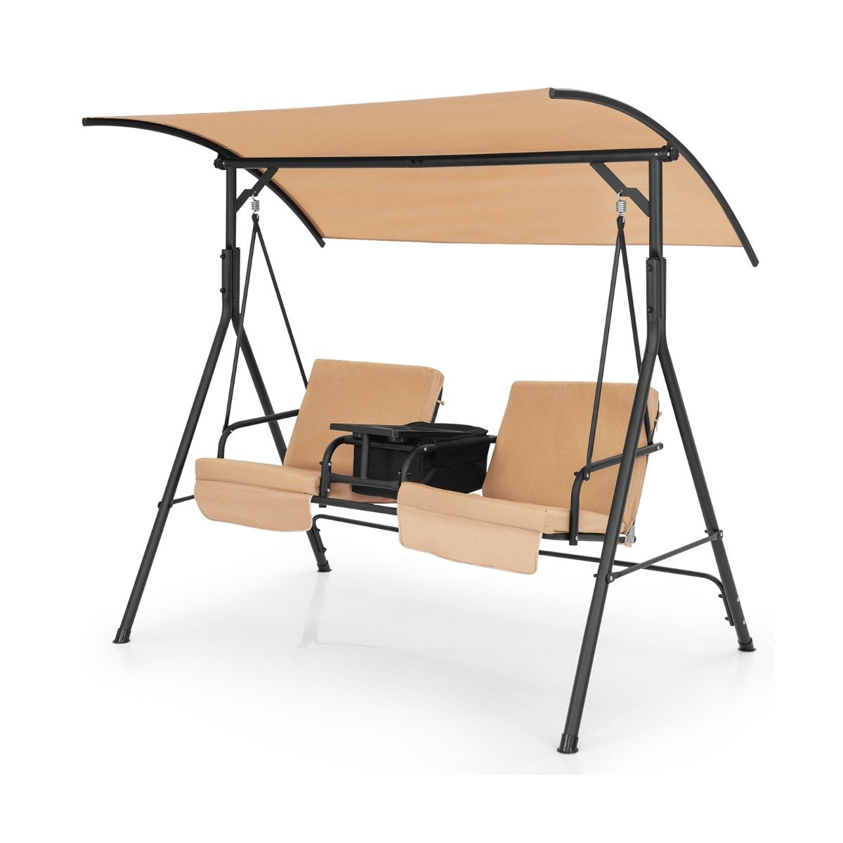 Desfrute de momentos agradáveis ao ar livre com este balanço de varanda com cobertura para 2 pessoas. Sente-se nas almofadas macias, pegue uma bebida refrescante e frutas da bolsa térmica, retire a taça de vinho do porta-copos na mesa central, ajuste o ângulo da cobertura e aproveite momentos de lazer com seus entes queridos. Este versátil balanço de varanda pode ser usado como balanço de jardim, balanço de quintal ou balanço de pátio para atender às suas diferentes necessidades. A bolsa térmica com fecho de velcro é removível. E a estrutura sólida com pés antiderrapantes garante segurança e estabilidade. Se você procura um balanço de varanda com cobertura como este, não hesite em fazer seu pedido! Montagem simples necessária. Duplique a felicidade com o design de 2 lugares. Estrutura reforçada com pés antiderrapantes proporciona excelente estabilidade. Almofadas de encosto e assento de alta densidade com tiras para melhor suporte. Ganchos de mola reforçados garantem um balanço suave. Bandeja giratória 360°, mesa central com porta-copos e bolsa térmica para uso conveniente. A cobertura ajustável oferece sombra fresca da luz solar. A estrutura de aço com revestimento em pó é resistente à ferrugem e fácil de limpar. Adequado para varanda, área da piscina, quintal, pátio e muito mais. Fácil de montar e manter.