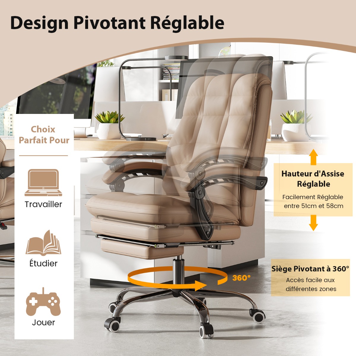 A cadeira de escritório é feita com couro PU de alta qualidade e estofamento de espuma resiliente para uma experiência de assento mais confortável. Para seu conforto, esta cadeira possui um encosto ajustável de 155°, permitindo que você defina o ângulo desejado. Seus apoios de braços acolchoados com conectores e apoio para os pés extensível ajudam você a manter uma postura saudável para relaxamento ideal. Ajuste facilmente a altura da cadeira e desfrute de movimentos giratórios suaves com seu assento giratório. Construída para durabilidade, esta cadeira executiva possui uma base de metal resistente e um elevador a gás que suporta até 136 kg. Deslize sem esforço sobre rodas universais para mobilidade rápida em qualquer espaço de trabalho, seja trabalhando, estudando ou se divertindo. Mais detalhes fáceis de usar estão esperando por você para descobrir. Atributos: Experiência de assento luxuosa: A cadeira de escritório é feita de couro PU de alta qualidade e espuma de alta densidade, oferecendo uma superfície luxuosa, confortável e fácil de limpar. Ao mesmo tempo, o assento macio possui estofamento espesso e oferece conforto superior. Conforto personalizado: Graças ao encosto reclinável de 155°, você pode recostar-se confortavelmente e relaxar na cadeira de computador. Os apoios de braços acolchoados e o apoio para os pés extensível fornecem suporte ergonômico para seus braços e pernas. Design giratório ajustável: Projetada para acomodar pessoas de diferentes alturas, a cadeira executiva possui uma altura de assento continuamente ajustável de 51 a 58 cm. O design giratório de 360° garante movimento suave em qualquer direção, permitindo que você acesse documentos ou colabore facilmente. Construção robusta: Projetada para confiabilidade duradoura, esta cadeira de computador é suportada por uma base de metal de 5 garras com uma generosa capacidade de peso de 136 kg. A robusta mola a gás permite um ajuste suave de altura, permitindo que você encontre rapidamente a posição perfeita para sentar. Mobilidade suave: Medindo 70 x 65 x 107-114 cm (C x L x A), a cadeira de escritório doméstico possui rodízios universais que deslizam sem esforço sobre várias superfícies. Esta cadeira é a escolha perfeita para qualquer espaço, seja para trabalhar, estudar ou se divertir, e oferece uma solução versátil que se adapta a todas as suas necessidades.
