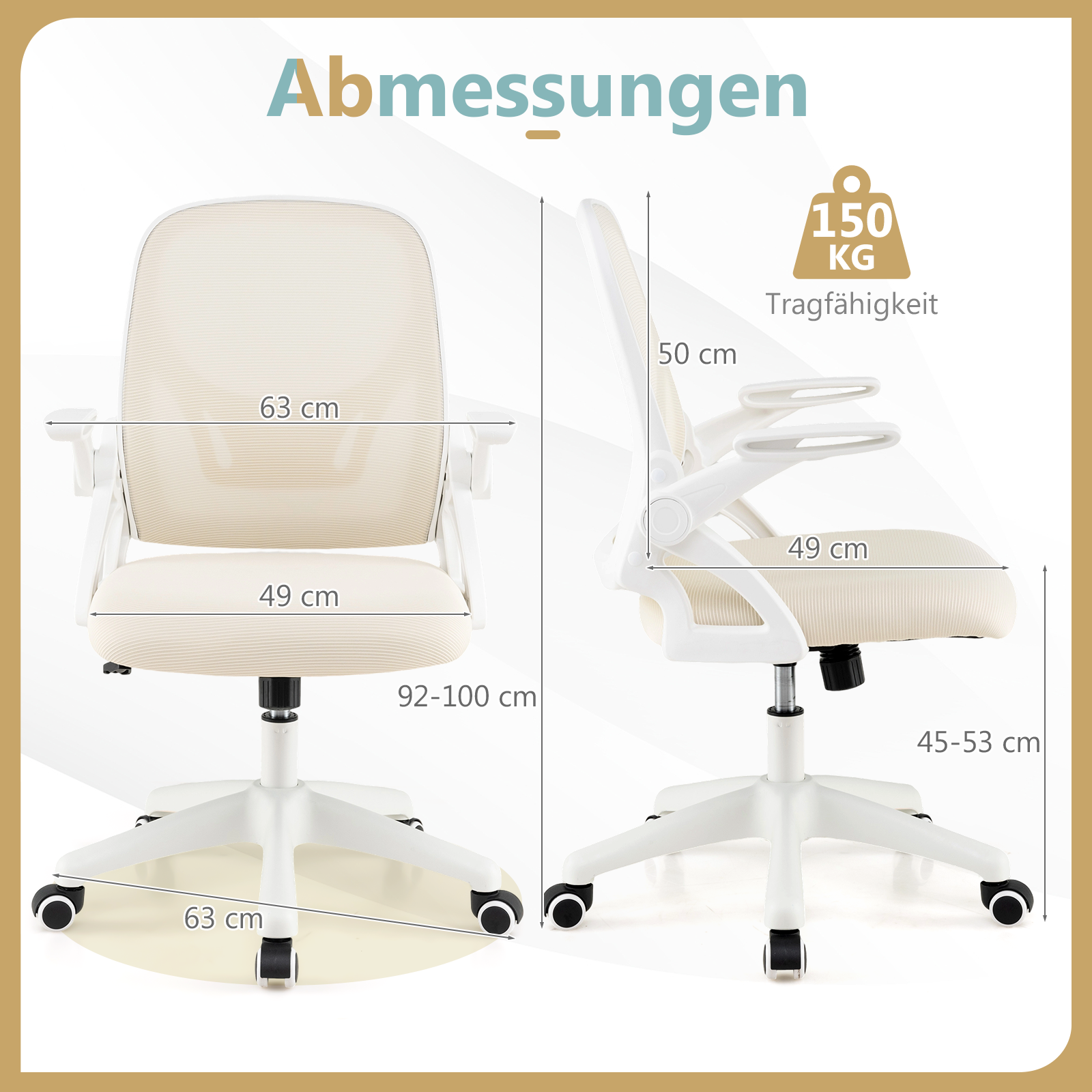 Cadeira de escritório ergonômica com apoios de braço dobráveis e função de balanço. Cadeira de computador bege.