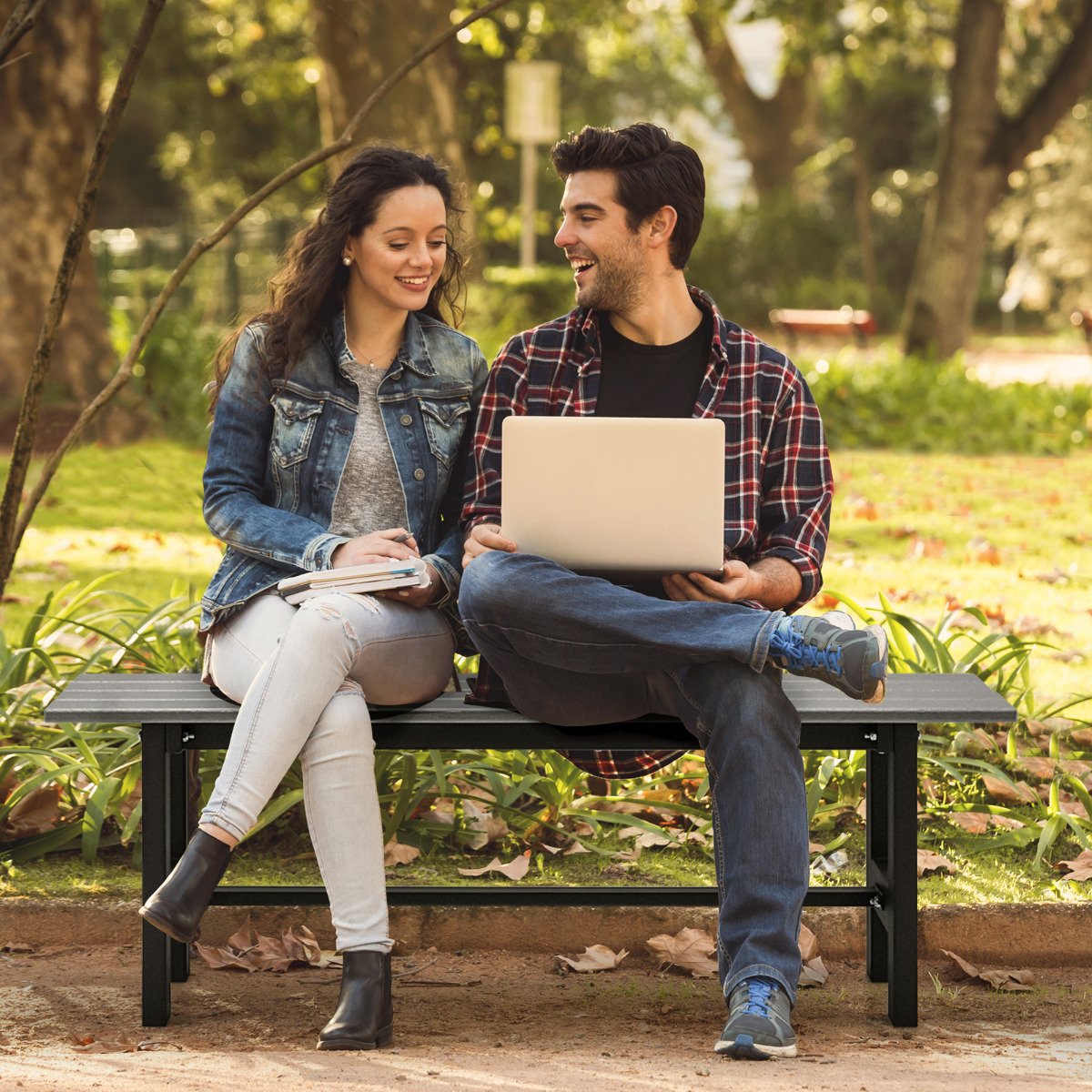 – O banco é feito de HDPE, um material resistente às intempéries e à água. – Equipado com protetores de pés para maior segurança. – Com ferragens robustas, este banco oferece alta estabilidade e durabilidade. – Ideal para áreas externas como pátio, jardim, quintal, etc. – As barras transversais reforçam a estabilidade de toda a estrutura. – Assento ripado respirável para maior conforto. – Assento espaçoso de 119 cm x 35 cm, grande o suficiente para acomodar duas pessoas confortavelmente.