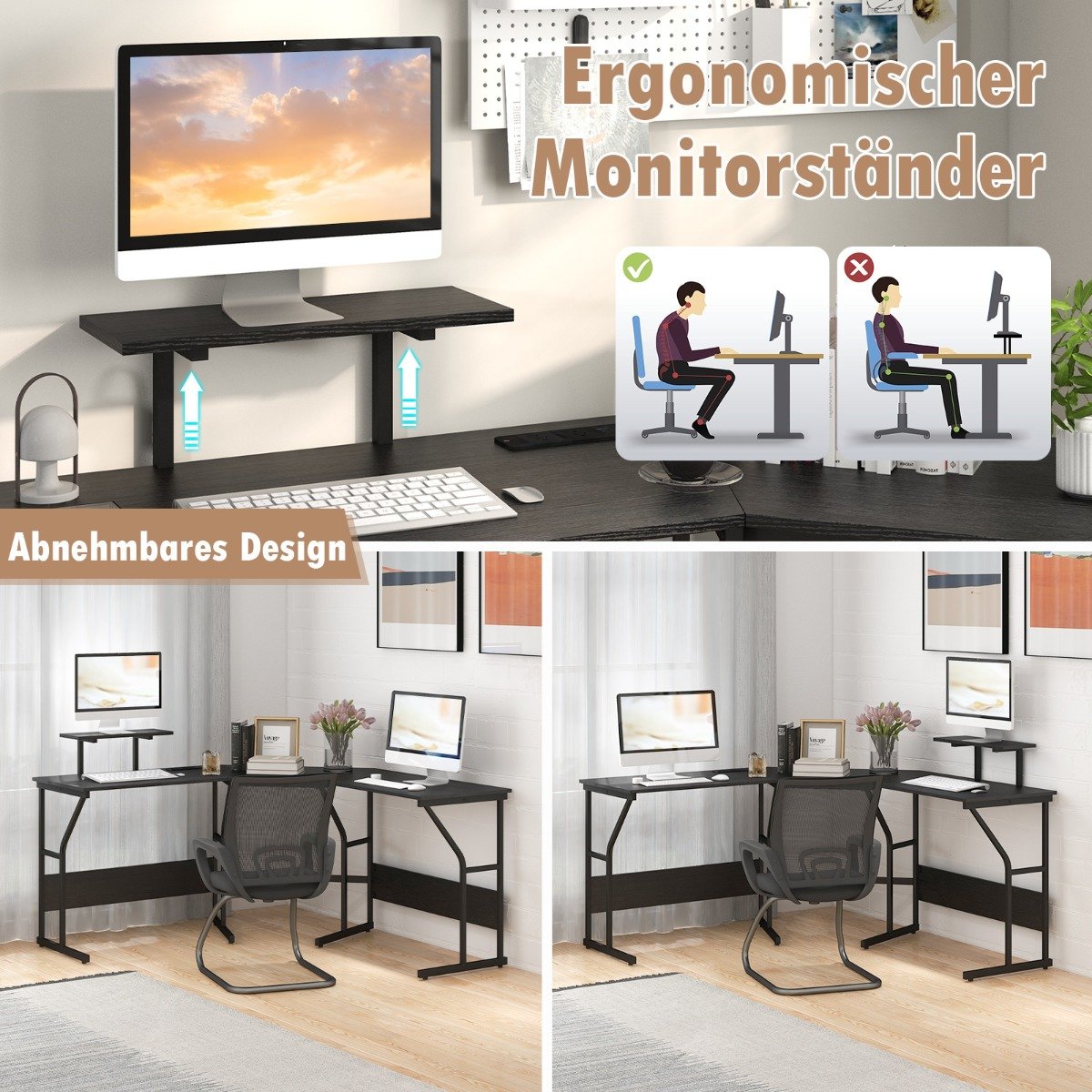 Mesa de computador de canto em formato de L com tomada elétrica e suporte de monitor ajustável, preta.
