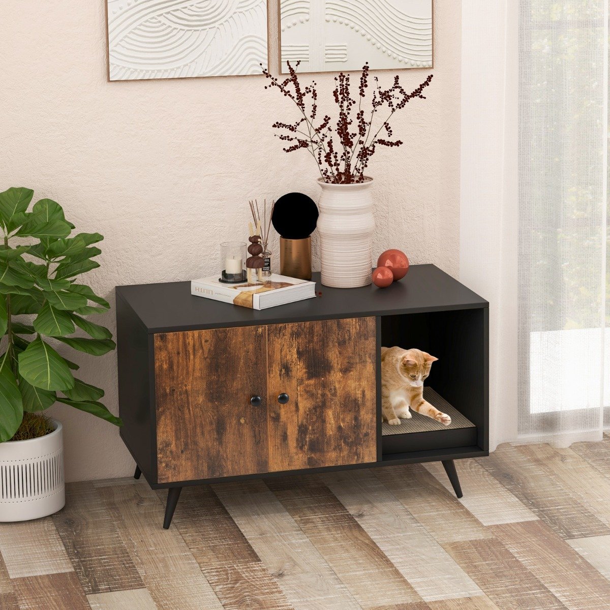 Deixe seus amigos peludos aproveitarem o tempo de penico com nosso cercado para caixa de areia para gatos! Incomodado com seu gato deixando areia em todos os lugares? Nosso versátil cercado para caixa de areia para gatos fornecerá a solução perfeita. Um armário privativo com porta dupla é perfeito para esconder a caixa de areia e evitar odores. E a ventilação na parte de trás do armário facilita a circulação de ar. Além disso, uma passarela sinuosa permite que os gatos acessem o compartimento para arranhar e moer suas garras, para que você não precise se preocupar com a destruição dos móveis delicados! Devido ao seu design elegante e uma mesa espaçosa, você também pode usá-lo como um armário de armazenamento ou lateral. Feito de madeira projetada de grau E0 e apoiado por pernas diagonais de metal, esta casa para gatos garante durabilidade e estabilidade superiores. Além disso, é equipado com dispositivo anti-tombamento, deixe você ficar tranquilo para usar! Então não hesite em levá-lo para casa como um presente para seus amigos peludos!     Ponto de bala: Armário privativo e adequado para animais de estimação: Um grande armário de porta dupla foi projetado para esconder a caixa de areia para gatos para evitar odores desagradáveis ​​e bagunça no quarto. Ou você pode colocar uma cama de gato para fornecer uma área de descanso confortável para gatos. E os 3 grandes orifícios de ar garantirão excelente ventilação e visão brilhante para gatos. Liberte o instinto natural dos gatos: Vindo com uma almofada de arranhar de gato grossa, os instintos de arranhar dos seus gatos serão totalmente satisfeitos. Além disso, é uma maneira eficaz de limpar os restos de comida do seu gato e distrair seu amigo peludo de seus móveis. Além disso, há uma entrada sinuosa para satisfazer a curiosidade do gato e a necessidade de explorar. Estabilidade e durabilidade aprimoradas: Feita de madeira projetada de grau EO premium e MDF, a casa de gato interna é mais sólida e resistente ao desgaste para suportar mais tempo. Além disso, o armário do banheiro do gato é equipado com pernas de metal inclinadas exclusivas e dispositivo anti-tombamento para melhorar a estabilidade geral e evitar oscilações. Mais do que uma casa de gato: Equipada com um grande armário, nossa casa de gato é uma maneira perfeita de esconder a caixa de areia do gato. Além disso, um tampo de mesa espaçoso oferece mais espaço para colocar plantas em vasos, porta-retratos, livros ou outros itens, tornando-se um armário lateral útil. E seu design elegante combina facilmente com diversas ocasiões. Fácil de montar e limpar: todas as peças necessárias estão numeradas nas instruções detalhadas, para que você possa segui-las facilmente para montar a casinha para gatos. Além disso, a superfície lisa da casinha é à prova d’água, então você pode simplesmente mantê-la limpa com um pano úmido. Características: Pode ser usado como um cercado para caixa de areia para gatos, casa para gatos ou armário lateral Grande mesa que fornece mais espaço extra para colocar decorações O armário de porta dupla é perfeito para esconder a caixa de areia para gatos ou colocar a cama para gatos O arranhador para gatos ajuda seu gato a esfregar as patas e a salvar seus móveis 3 saídas de ar previnem eficazmente o odor e mantêm o espaço interno seco A entrada em espiral fornece acesso fácil para os gatos explorarem mais diversão Feito de madeira de engenharia de grau EO premium para boa durabilidade Pernas inclinadas de metal sólido fornecem suporte mais forte para adicionar estabilidade O dispositivo antitombamento garante o uso seguro para famílias com animais de estimação ou crianças A trava magnética da porta e a dobradiça de metal permitem que a porta abra e feche facilmente Aparência moderna e elegante se adapta a vários estilos de decoração As instruções com ilustrações facilitam a instalação Especificações: Cor: Preto + Natural Material: Madeira projetada E0 + MDF Dimensão geral: 90 x 50 x 54 cm (C x L x A) Dimensão do gabinete: 57 x 48 x 39 cm (C x L x A) Tamanho da placa de arranhar: 42 x 28 x 5 cm (C x L x A) Capacidade de peso da mesa: 60 kg Capacidade de peso do gabinete: 30 kg Peso líquido: 19 kg O pacote inclui: 1 x caixa de areia para gatos 1 x instruções