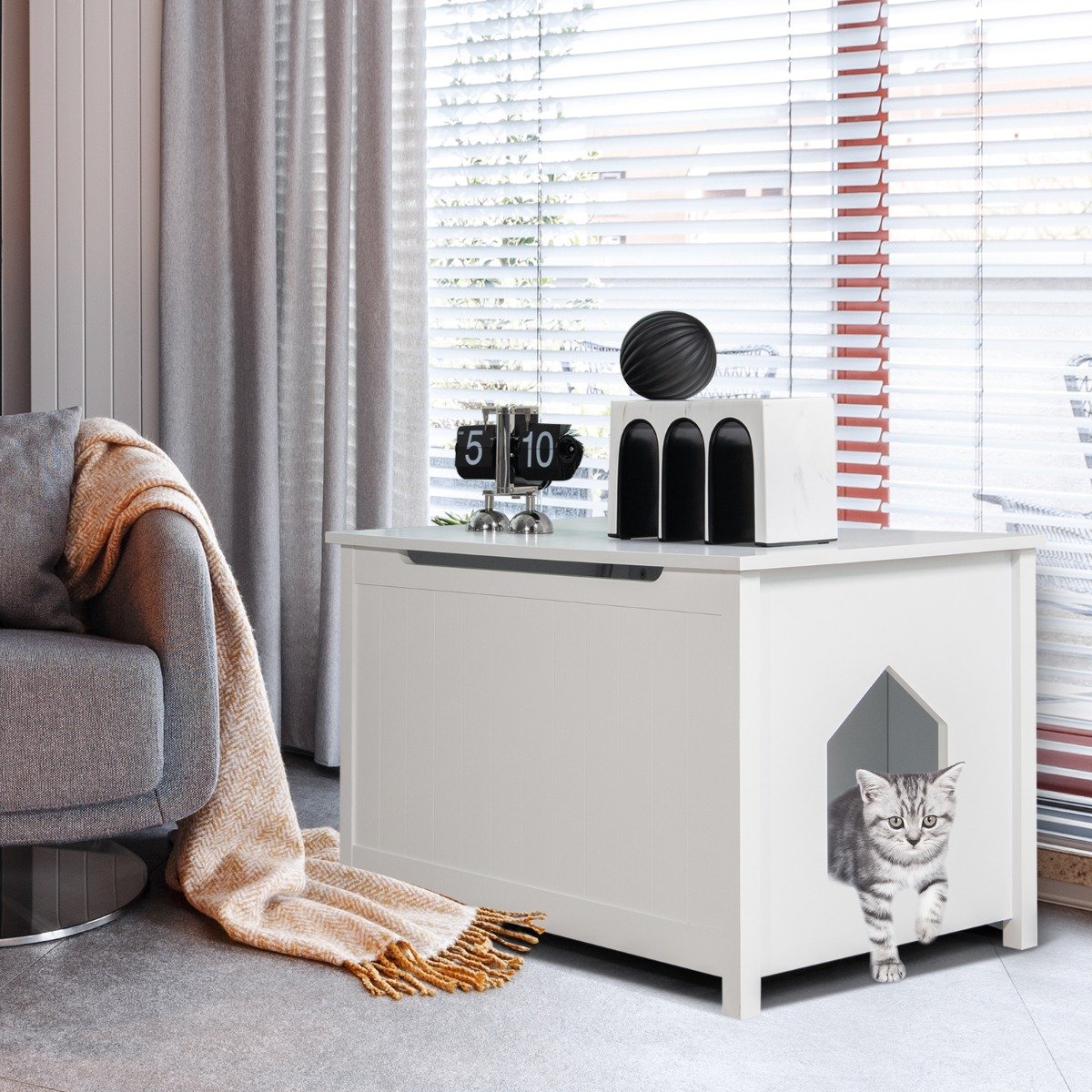 Ótimo para esconder a caixa de areia enquanto fornece privacidade para seu adorável gatinho! Este grande móvel de caixa de areia para gatos mede 80,5 x 51 x 51 cm (C x L x A), que se adapta a gatos grandes e à maioria das caixas de areia, e o divisor interno pode ser ajustado ou removido para ajudar a criar layouts internos. Pode ser usado como uma casa de gato, bem como uma mesa lateral ou mesa de cabeceira. Com a aparência elegante e moderna, o móvel de caixa de areia para gatos pode ser uma decoração perfeita e iluminar seu quarto. Especialmente, nossa casa de madeira para gatos é projetada com uma tampa articulada, trazendo conveniência para recolher a areia e limpar o interior, e as hastes de gás premium abrem ou fecham automaticamente para mais segurança. Além disso, há 2 ganchos internos para pendurar alguns brinquedos de gato ou ferramentas de limpeza ao alcance. E as entradas laterais permitem que os gatos entrem e saiam perfeitamente, garantindo a circulação de ar. Ponto de bala: Design multifuncional: Este móvel multifuncional para caixa de areia para gatos não pode ser apenas um cercado para esconder uma caixa de areia para gatos ou como uma casa para gatos brincarem e dormirem, mas também pode ser servido como mesa de cabeceira ou mesa lateral, que também pode combinar perfeitamente com a decoração da sua casa. Hora do penico particular para amigos felinos: A casa de areia para gatos fechada fornece um lugar privado para seu gatinho ter privacidade para fazer xixi e evitar algumas bagunças desnecessárias que podem afetar sua vida. Além disso, também evita que cães ou crianças pequenas entrem e assustem o gato ou sujem o chão por curiosidade. Design humanizado: O banheiro oculto para gatos com tampa flip-top é equipado com 2 hastes de gás resistentes que ajudam a tampa a fechar lenta e suavemente para evitar esmagar sua mão, e existe uma alça de ranhura embutida para fácil abertura e fechamento. Além disso, possui 2 ganchos de metal dentro, trazendo conveniência para pendurar itens. Divisória funcional e Entradas laterais: A caixa de areia automática para gatos foi projetada com um divisor removível e ajustável, permitindo que você altere o layout interno para criar espaço extra para armazenar areia para gatos, pás ou outros suprimentos para gatos. Além disso, com 2 orifícios grandes, a casinha para gatos permite que os gatinhos entrem à vontade e promove melhor ventilação. Material durável e fácil montagem: A mesa lateral da casinha para gatos adota pernas de apoio em madeira de pinho, garantindo grande durabilidade e robustez, e pode carregar até 100 kg. Além disso, equipada com instruções detalhadas e ilustrações fáceis de entender, é fácil de configurar. Características: Pode ser usado como um recinto para caixa de areia para gatos, casa para gatos, mesa de cabeceira, mesa lateral e muito mais Permite que os gatos encontrem uma sensação de segurança no ambiente fechado O design flip-top ajuda a remover a garagem e limpar o interior facilmente As hastes de gás ajudam a parte superior a abrir ou fechar automática e lentamente para segurança A alça de ranhura embutida traz conveniência para abrir a porta Com 2 ganchos de metal dentro, fácil de armazenar e buscar ferramentas de limpeza e brinquedos O divisor pode ser colocado à esquerda, direita ou removido, layout interno DIY 2 grandes buracos de gato evitam que os odores fiquem presos dentro e permitem que os gatos pulem para dentro ou para fora facilmente A placa de MDF com pintura NC à prova d’água, fácil de limpar As pernas de suporte são feitas de madeira de pinho, duráveis, robustas e resistentes à deformação Especificações: Cor: Branco Material: MDF, madeira de pinho Dimensão geral: 80,5 x 51 x 51 cm (C x L x A) Tamanho do buraco do gato: 20 x 23 cm (C x L) Tamanho máximo adequado da bandeja de areia: 70 x 45 x 43 cm (C x L x A) Peso líquido: 14 kg Capacidade de peso do tampo da mesa: 50 kg Capacidade de peso da placa inferior: 50 kg O pacote inclui: 1 x casa para gatos 1 x manual do usuário