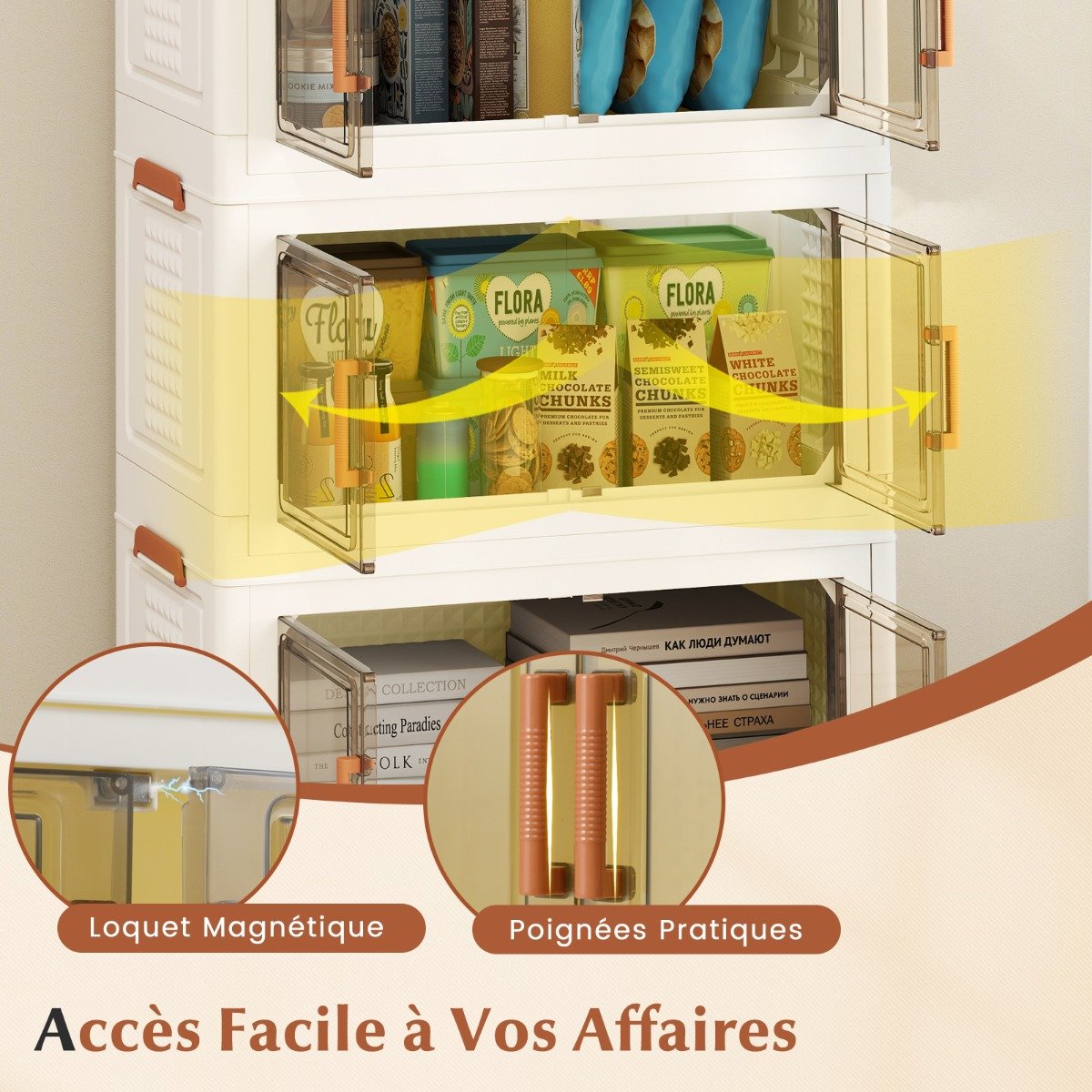 Otimize seu espaço de armazenamento com estas caixas de armazenamento! Seja para organizar roupas da estação, utensílios de cozinha ou livros, estas caixas de armazenamento oferecem uma solução conveniente. Você pode dobrá-las facilmente quando não estiverem em uso para armazenamento compacto ou empilhá-las para maximizar seu espaço de forma eficiente. As portas magnéticas de abertura frontal fornecem fácil acesso aos itens armazenados. Para maior conveniência, os recipientes de armazenamento são equipados com alças fáceis de segurar. Além disso, as 4 rodas universais (2 com freios) permitem que você os mova sem esforço pela sua casa. Estas caixas de armazenamento versáteis podem ser usadas como organizador de roupas, sapateira, armário de lanches ou até mesmo um armário de ferramentas. Atributos: 【Grande capacidade de armazenamento】Com uma capacidade generosa, as caixas de armazenamento fornecem amplo espaço de armazenamento para livros, lanches, roupas ou itens diversos. Além disso, as caixas de armazenamento de plástico ajudam a organizar seu espaço e manter seus pertences organizados. 【Design dobrável e Fácil Montagem】Os recipientes de armazenamento dobráveis ​​podem ser facilmente montados em segundos com um sistema de conexão de encaixe. Quando não estiver em uso, cada recipiente pode ser dobrado para fácil armazenamento, e seu design empilhável maximiza o espaço vertical em sua casa. 【Design de Acesso Rápido】Portas transparentes com fecho magnético permitem acesso rápido e fácil ao conteúdo. Além disso, alças convenientes facilitam a abertura ou o fechamento dos recipientes ao reorganizar ou acessar itens armazenados. 【Mova e Pare à Vontade】Equipados com 4 rodas universais, 2 das quais com freios, os recipientes de armazenamento dobráveis ​​são incrivelmente portáteis. Você pode movê-los facilmente de um cômodo para outro ou travá-los no lugar. 【Solução de Armazenamento Versátil】O organizador de armazenamento empilhável é ideal para uso na sala de estar, cozinha, quarto, armário ou até mesmo no porta-malas do carro, proporcionando amplo espaço para armazenar vários itens de forma organizada e eficiente.