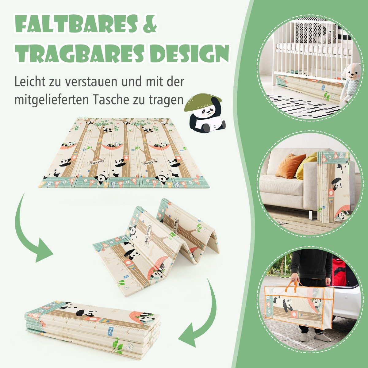 Traga ao seu bebê um espaço de brincadeira seguro e confortável com nosso tapete de brincadeira dobrável para bebês! Este tapete de brincadeira extra grande de 200 x 180 cm apresenta um design reversível para opções de brincadeira versáteis. Um lado vem com padrões coloridos e envolventes de girafa, enquanto o outro lado apresenta padrões fofos de panda/veado. Feito com cuidado, este tapete de brincadeira fornece uma superfície macia e acolchoada que ajuda a proteger seu bebê de solavancos e quedas enquanto se envolve em atividades lúdicas. Além disso, a superfície à prova d’água garante que qualquer derramamento ou acidente possa ser facilmente limpo. O design dobrável facilita o transporte e o armazenamento do tapete de brincadeira. Além disso, a bolsa de transporte incluída permite que você o leve sem esforço para onde quer que vá. Design reversível de dupla face: Este tapete de chão de 200 x 180 cm oferece um espaço extra grande para o bebê engatinhar, brincar, descansar e muito mais. Além disso, o tapete de brincar apresenta diferentes estampas de animais e alfabetos e números em relevo em cada lado, ajudando a desenvolver a capacidade cognitiva, a imaginação, etc. das crianças. Proteja a saúde do seu bebê: Feito de forro XPE de alta densidade com tinta vegetal e filme PE espesso, este tapete dobrável para engatinhar para bebês é livre de BPA, insípido e anti-rasgo. Além disso, o tapete altamente elástico com espessura de 1,4 cm oferece ótimo amortecimento para proteger seu bebê de colisões. Superfície antiderrapante e fácil limpeza: A superfície côncava e convexa em cada lado não apenas impede que o tapete de brincar do bebê deslize, mas também protege o bebê de escorregar. Além disso, a superfície à prova d’água é fácil de limpar apenas com um pano úmido. Design dobrável e portátil: O tapete de brincar infantil pode ser convenientemente dobrado em um tamanho compacto e armazenado embaixo da cama ou ao lado do sofá quando não estiver em uso. Além disso, uma bolsa de viagem está incluída para você levá-lo para qualquer lugar com facilidade. Ampla gama de aplicações: Este tapete dobrável para bebês é versátil, podendo ser usado como tapete para bebês, tapete de brincadeira, tapete de ioga, tapete de piquenique e muito mais. É adequado para todos os tipos de atividades infantis e momentos de união entre pais e filhos.