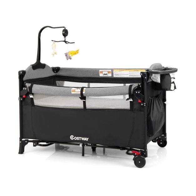 Nosso berço conversível 5 em 1 será um ótimo companheiro para o seu bebê. Com design multifuncional, este berço pode servir como trocador, moisés, cama compartilhada, berço e cercadinho. Além disso, você pode ajustar o apoio de braço em 4 alturas, de acordo com a altura da sua cama. Feito de tubos de ferro de alta qualidade, o berço com 7 pontos de apoio possui uma estrutura estável. O tecido de malha não só proporciona melhor ventilação, como também permite que os pais observem melhor o bebê. Além disso, o confortável colchão de tecido catiônico apresenta excelente resistência ao desgaste, absorção de água e anticorrosão. Além disso, este cercadinho dobrável pode ser rapidamente dobrado em um tamanho compacto e colocado na bolsa de transporte incluída para fácil armazenamento e transporte. Características: O design multifuncional 5 em 1 atende às suas diferentes necessidades Trocador removível com cinto de segurança Berço removível com colchão confortável feito de tecido catiônico Projetado com um zíper lateral suave que permite que o bebê entre ou saia facilmente Uma bolsa para guardar fraldas e outros itens pode ser montada no apoio de braço 3 brinquedos giratórios pendurados com caixa de música 4 alturas de apoio de braço ajustáveis ​​se adaptam a diferentes alturas de camas dos pais A tira de fixação fornece segurança adicional e fácil instalação ao lado da sua cama Estrutura forte com estrutura de ferro resistente e suporte estável de 7 pontos Tecido oxford durável e de alta qualidade, seguro para bebês O tecido de malha garante circulação de ar fresco e melhor observação Equipado com 2 rodas e freios O design dobrável permite fácil armazenamento e transporte Inclui uma bolsa de transporte para viagens, armazenamento e muito mais Como dobrar? Como desdobrar?