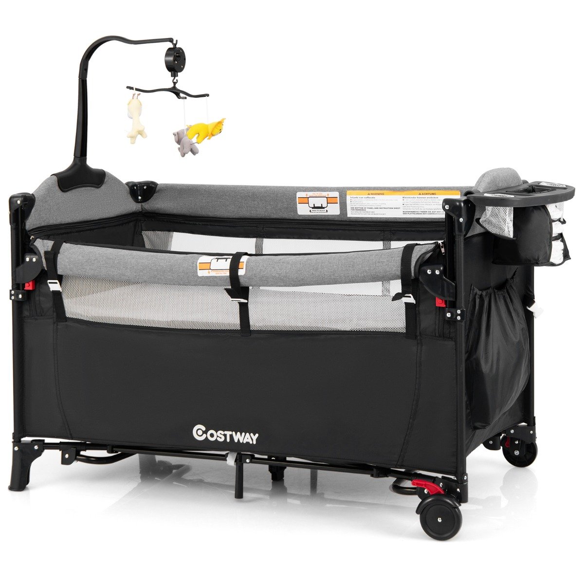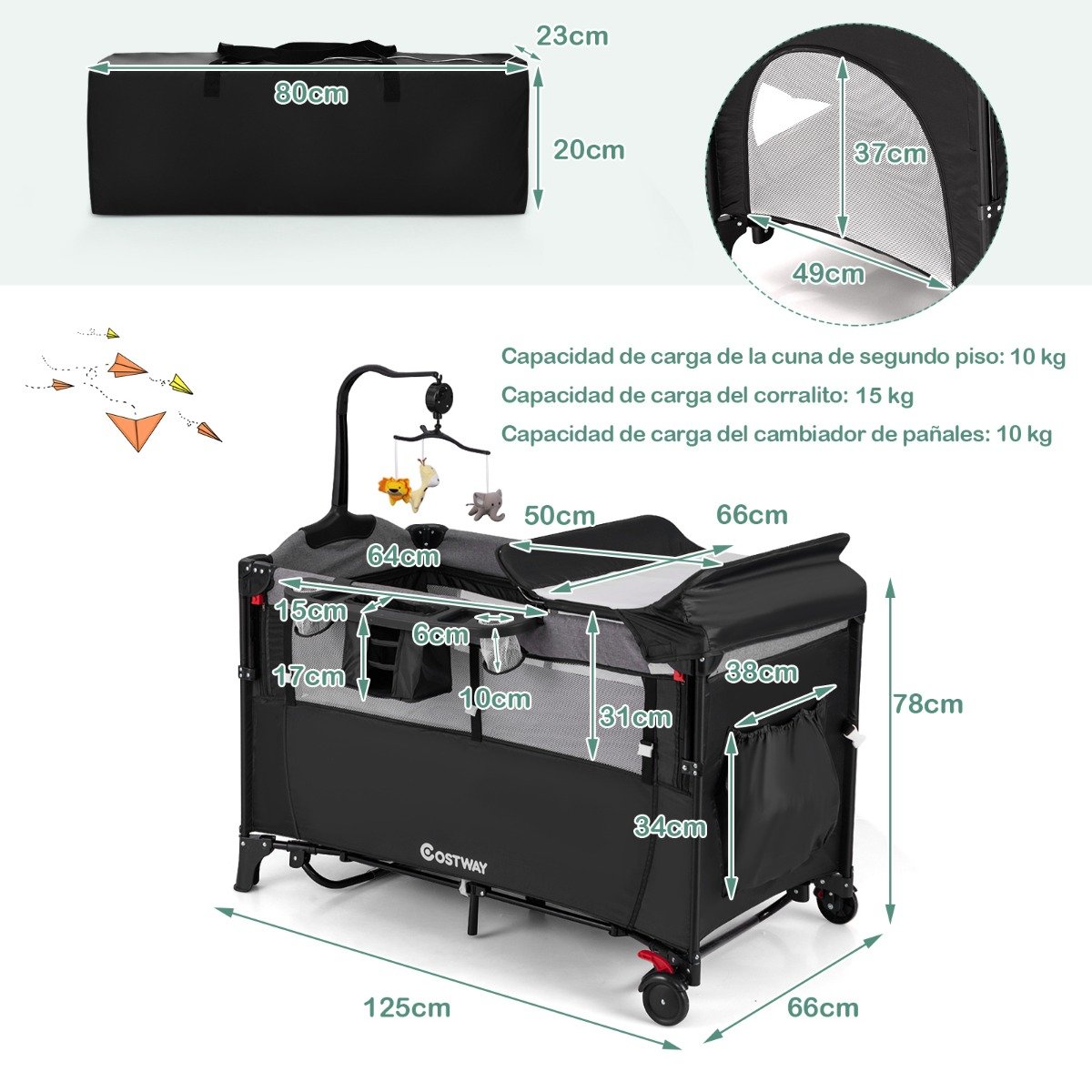 Nosso berço conversível 5 em 1 será um ótimo companheiro para o seu bebê. Com design multifuncional, este berço pode servir como trocador, moisés, cama compartilhada, berço e cercadinho. Além disso, você pode ajustar o apoio de braço em 4 alturas, de acordo com a altura da sua cama. Feito de tubos de ferro de alta qualidade, o berço com 7 pontos de apoio possui uma estrutura estável. O tecido de malha não só proporciona melhor ventilação, como também permite que os pais observem melhor o bebê. Além disso, o confortável colchão de tecido catiônico apresenta excelente resistência ao desgaste, absorção de água e anticorrosão. Além disso, este cercadinho dobrável pode ser rapidamente dobrado em um tamanho compacto e colocado na bolsa de transporte incluída para fácil armazenamento e transporte. Características: O design multifuncional 5 em 1 atende às suas diferentes necessidades Trocador removível com cinto de segurança Berço removível com colchão confortável feito de tecido catiônico Projetado com um zíper lateral suave que permite que o bebê entre ou saia facilmente Uma bolsa para guardar fraldas e outros itens pode ser montada no apoio de braço 3 brinquedos giratórios pendurados com caixa de música 4 alturas de apoio de braço ajustáveis se adaptam a diferentes alturas de camas dos pais A tira de fixação fornece segurança adicional e fácil instalação ao lado da sua cama Estrutura forte com estrutura de ferro resistente e suporte estável de 7 pontos Tecido oxford durável e de alta qualidade, seguro para bebês O tecido de malha garante circulação de ar fresco e melhor observação Equipado com 2 rodas e freios O design dobrável permite fácil armazenamento e transporte Inclui uma bolsa de transporte para viagens, armazenamento e muito mais Como dobrar? Como desdobrar?