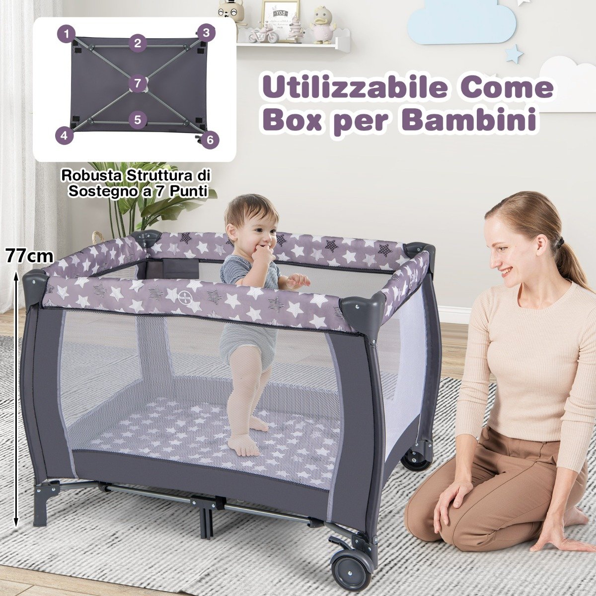 Facilite os cuidados com o bebê com este berço de viagem dobrável! O berço de viagem dobrável vem com um trocador e um berço de tamanho normal para acomodar o crescimento do seu bebê. Além disso, o tecido Oxford de alta qualidade e a estrutura de metal resistente garantem durabilidade e estabilidade. A malha transparente e respirável permite que você saiba a condição do seu bebê. Com um colchão confortável, seu bebê pode dormir profundamente e docemente. Além disso, os brinquedos adoráveis e a caixa de música tornam este berço de viagem portátil ainda mais atraente para recém-nascidos. Quando você precisa mover o berço de viagem dobrável, as rodas suaves são muito úteis. Além disso, é super fácil de desdobrar ou dobrar. Com uma bolsa de transporte conveniente, você pode levá-lo para onde quer que vá. Design conversível 3 em 1: o berço de viagem se transforma em berço, cercadinho e trocador, crescendo com seu bebê do nascimento aos 36 meses. O trocador à prova d’água inclui um cinto de segurança para uso seguro. Quando o bebê está dormindo no berço ou brincando no cercadinho, os pais podem ficar de olho em seus pequenos através da malha respirável de 4 lados. Estrutura estável e segura: Graças ao design de suporte de 7 pontos, este berço de bebê pode ficar em pé sem balançar. A altura adequada de 74 cm do chão, com cantos arredondados e paredes de tela nos quatro lados, ajuda os bebês a aprenderem a ficar em pé. Além disso, o trocador é equipado com um cinto de segurança, tornando-o conveniente para trocar fraldas. Função de entretenimento: Este berço de viagem dobrável para bebês vem com 3 brinquedos giratórios com sons para manter os bebês entretidos. Além disso, a caixa de música possui funções de luz, música e vibração para maior diversão. Portanto, este berço de viagem 3 em 1 é um presente ideal para bebês de 0 a 36 meses. Detalhes para bebês: Com um colchão macio e dobrável, o berço de viagem dobrável permite que os bebês tirem uma soneca confortavelmente. Os fechos de velcro ajudam a proteger o colchão. Além disso, a bolsa de fraldas na lateral contém itens essenciais para o bebê para fácil acesso. Fácil de montar e dobrar: O berço de viagem 3 em 1 é fácil de montar e não requer ferramentas. Veja como montar: 1. Puxe o berço, 2. Desdobre os 4 lados, 3. Pressione o centro do chão, 4. Insira o colchão. Ele também vem com uma bolsa de transporte para facilitar cada viagem.