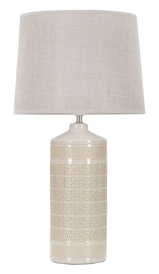 Candeeiro de mesa em cerâmica com elegantes decorações geométricas em relevo. Completo com abajur de tecido branco.
