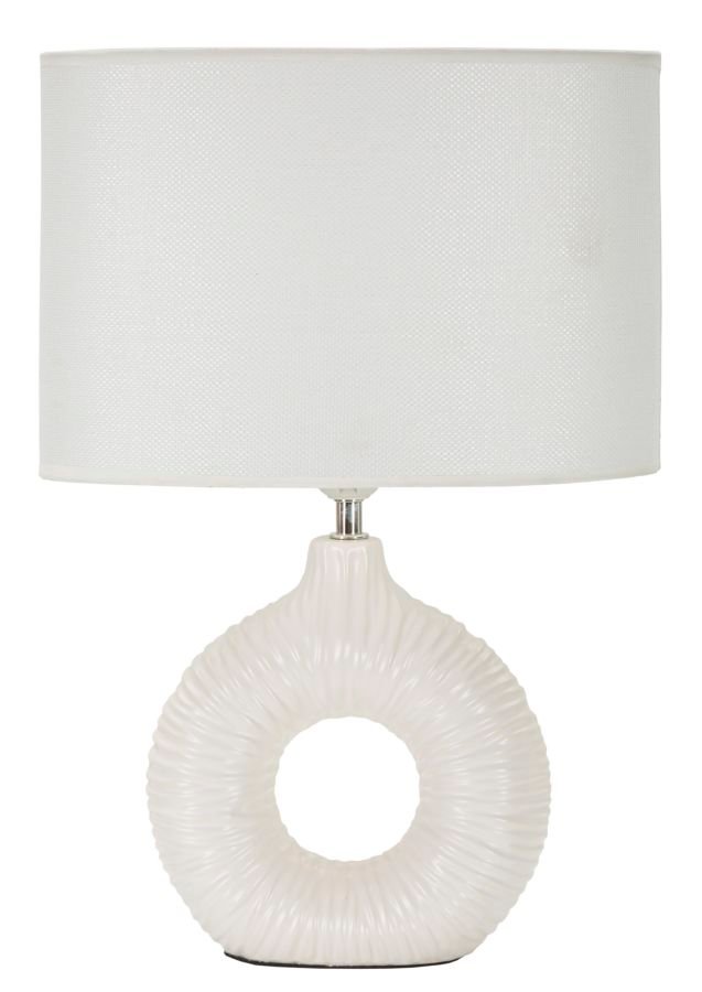 Candeeiro de cabeceira com base branca, design elegante com furo central único e decorações tipo cortina que dão um toque de requinte ao seu ambiente. Completo com abajur de tecido branco.