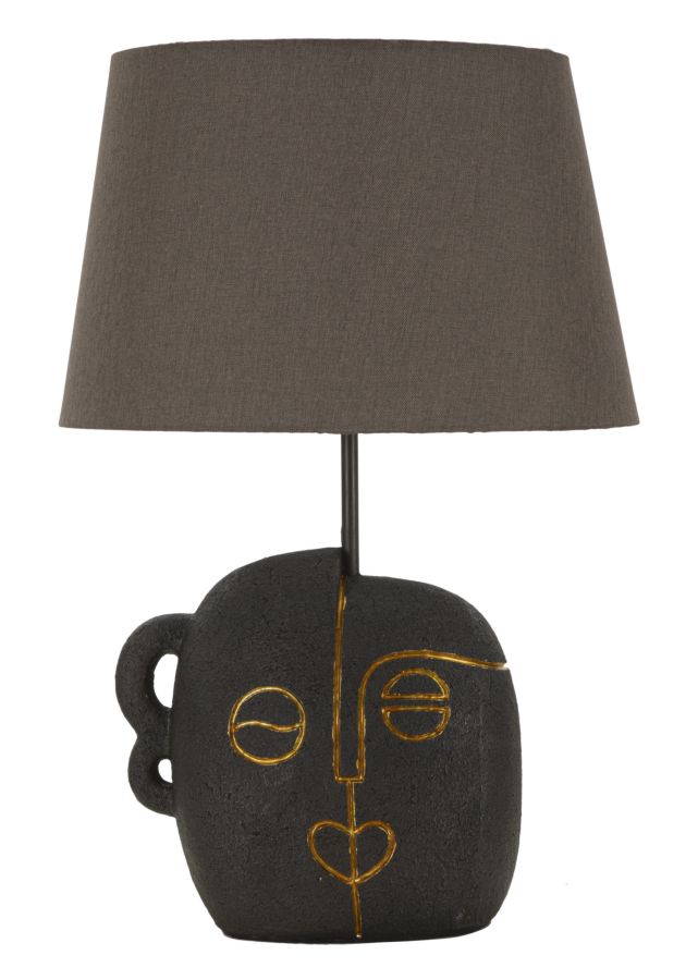 Candeeiro de mesa em resina com formato inspirado num rosto tribal embelezado com detalhes dourados. Completo com abajur em tecido cinza.