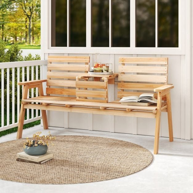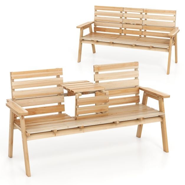 ● A mesa do meio cria o espaço perfeito para seus itens ● Simplesmente dobre a mesa para desfrutar de assentos extras quando não estiver em uso ● Evite desdobramento acidental graças à trava de segurança ● Área de assento de 58″ x 18″ para 2 a 3 pessoas sentadas juntas ● Estável e durável para usar com madeira de abeto rústica e sem rebarbas ● Vem com forte capacidade de carga de até 710 libras ● Faz você se sentir confortável com amplos apoios de braços e superfície de ripas ● Mude sua cor pintando livremente para liberar sua criatividade ● Adequado para pátio, jardim, varanda e quintal