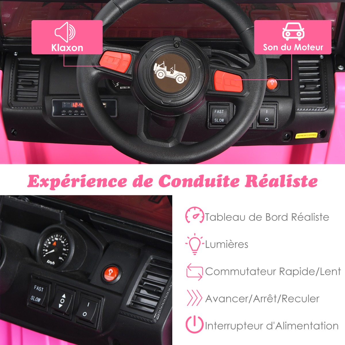 O caminhão é especialmente projetado para crianças loucas por carros! É feito de PP e ferro selecionados, então a capacidade de carga de 30 kg é bem garantida. Em seguida, dois motores potentes são equipados para alcançar uma direção suave. Graças ao início lento, as crianças não precisam ter medo de aceleração ou parada repentina. Além disso, há duas maneiras de controlar o caminhão infantil. O controle remoto 2.4G é projetado para os pais, enquanto as crianças também podem controlar o carro manualmente. Como uma réplica perfeita de um veículo real, o caminhão elétrico tem um volante realista para controle de direção e o som da buzina e do motor, bem como um painel multifuncional para luz dianteira/traseira, alta/baixa velocidade, etc. Um destaque pessoal é o tocador de música. Além de 3 músicas predefinidas e função de rádio, ele também tem uma porta USB e Bluetooth para reproduzir músicas de fontes externas. Com 4 rodas resistentes ao desgaste, crianças de 3 a 8 anos podem se divertir dirigindo em várias ocasiões. Lembrete: o volante e o controle remoto requerem pilhas (não incluídas). Atributos: Partida suave e velocidades opcionais: Dois motores separados são potentes o suficiente para garantir uma condução suave do carro infantil, enquanto a partida lenta é útil para obter uma aceleração lenta ao dar a partida e parar sem assustar as crianças. Além disso, duas velocidades são oferecidas, velocidade baixa de 2,6-3 km/h e velocidade alta de 5,5-6 km/h para atender a diferentes necessidades. Opções de controle duplo para maior segurança: Os pais podem controlar o caminhão com o controle remoto 2.4G incluído. Em detalhes, ele tem um botão liga/desliga e outros botões para mudar a direção, luzes e velocidade. As crianças também podem ter a opção de controlar todas as funções do caminhão manualmente. Música para mais diversão: Um tocador de música torna a direção ainda mais divertida. Ele tem 3 músicas predefinidas e uma função de rádio para manter as crianças entretidas, enquanto a porta USB e Bluetooth permitem que você se conecte ao caminhão e reproduza músicas baixadas. Você pode ver o nível restante da bateria pelo número exibido. Detalhes para uma direção confortável: O interior do carrinho de brinquedo imita um veículo real. Em particular, as crianças podem fazer sons de buzina e motor pressionando botões no volante. Juntamente com as luzes dianteiras e traseiras, eles dão a sensação de estar realmente dirigindo na estrada. O carrinho de passeio foi projetado para crianças de 3 a 8 anos. Perfeito para passeios ao ar livre: com 4 rodas robustas com diâmetro de 30 cm, o carrinho de passeio pode ser usado em estradas de asfalto, estradas de tijolos e pastagens. Além disso, seu PP e ferro de alta qualidade são muito duráveis e aumentam a capacidade total de carga para até 30 kg. Por fim, o controle remoto e o volante precisam de pilhas, que não estão incluídas na entrega. Características: Motores duplos fornecem desempenho forte e direção suave Função de partida suave para eliminar o risco de aceleração e paradas repentinas Projetado com alta e baixa velocidade para atender a diferentes necessidades de direção Controle remoto 2.4G para mudar de direção, luz e velocidade As crianças podem controlar o carrinho de brinquedo manualmente por meio de um painel realista Função de áudio com porta USB, rádio, música predefinida e Bluetooth O controle remoto e o volante requerem pilhas, que não estão incluídas Cinto de segurança, pedal e espelho retrovisor proporcionam mais diversão Rodas resistentes ao desgaste com um diâmetro de 30 cm garantem estabilidade Um presente ideal para crianças de 3 a 8 anos