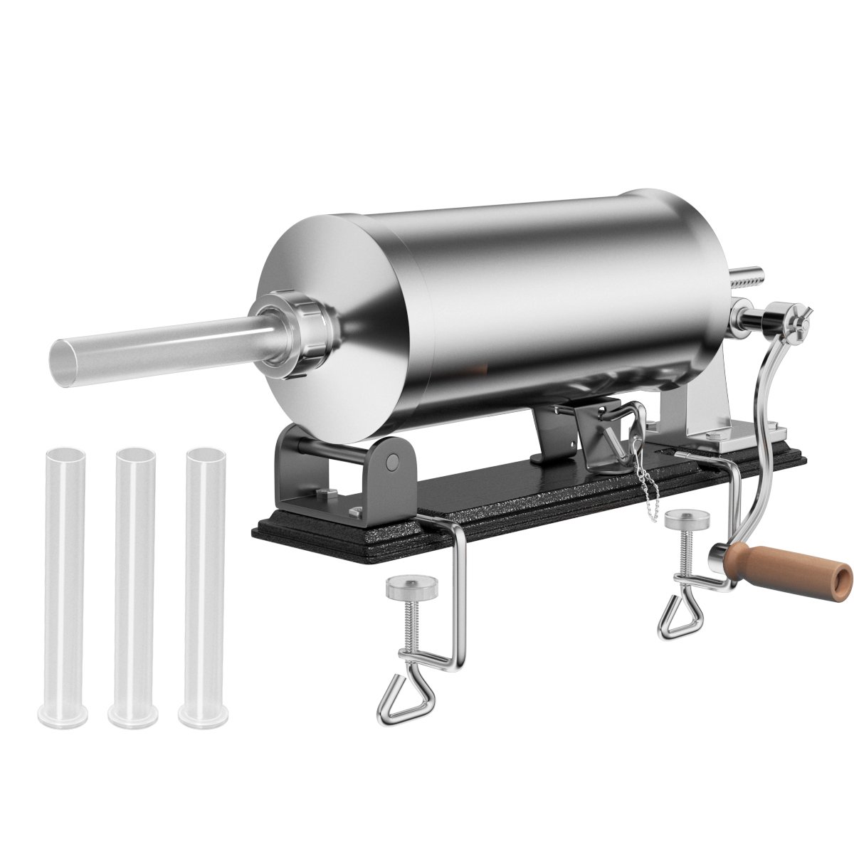 Novo e de alta qualidade Design horizontal Liga de alumínio de alta qualidade Construção durável Fácil de operar e limpar Vem com 4 tubos de salsicha de tamanhos diferentes Nível de ruído livre Ideal para uso doméstico ou comercial