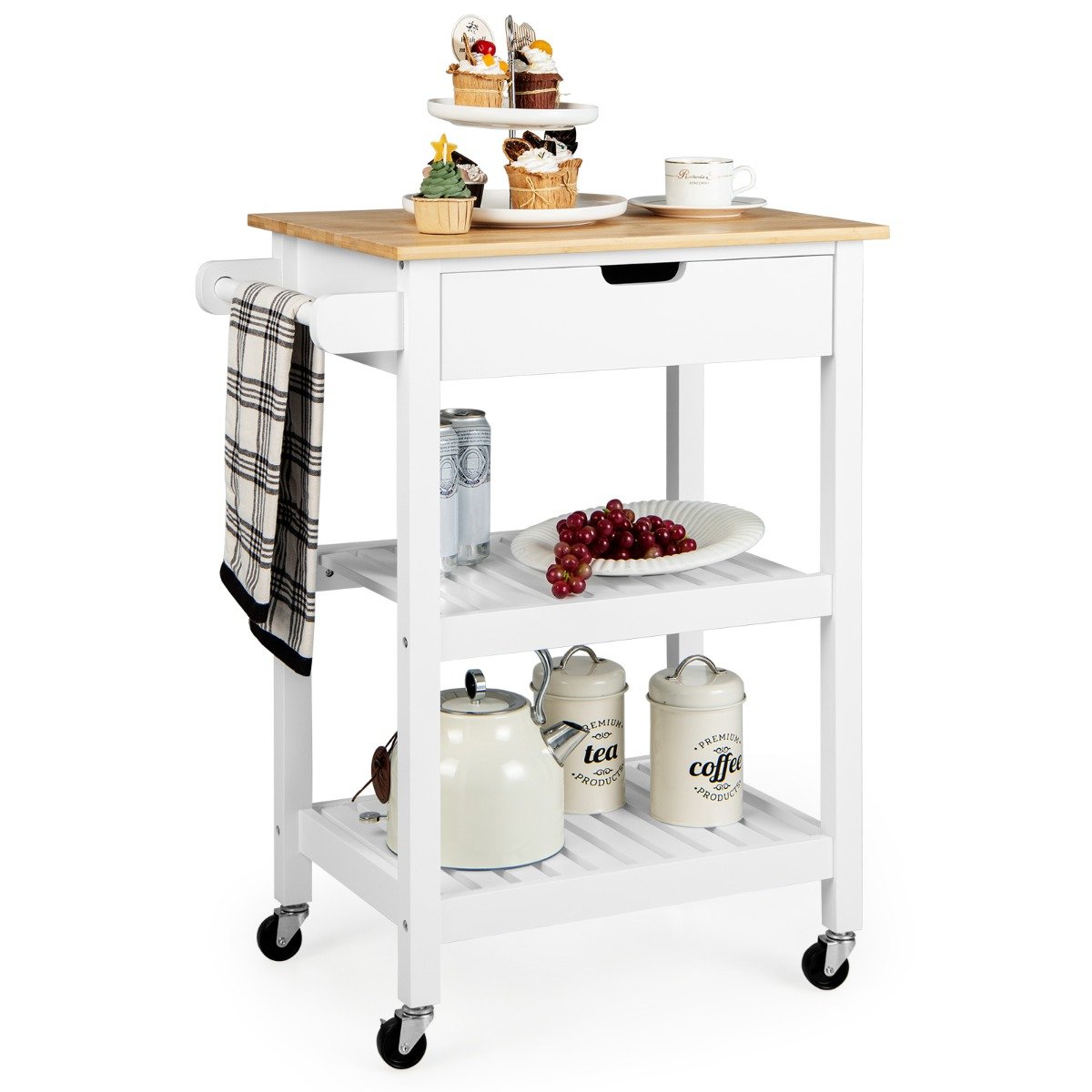Carrinho de Ilha de Cozinha de 3 Níveis com Tampo de Bambu – Branco