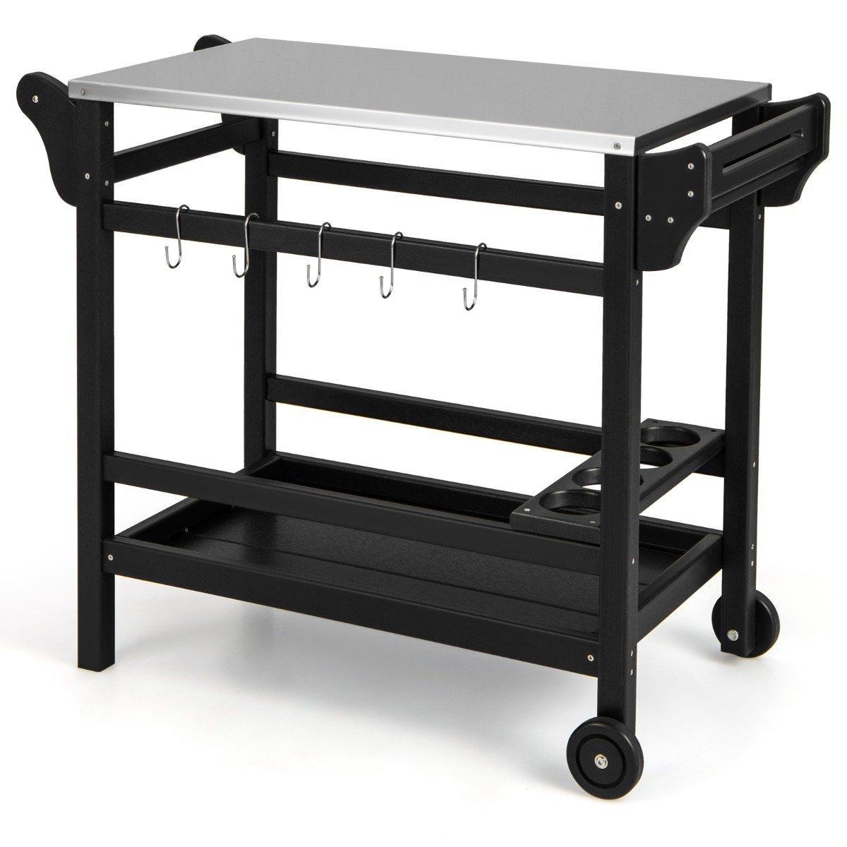 Carrinho de jantar móvel para exterior com mesa, suporte para forno de pizza em HDPE e tampo em aço inoxidável – Preto
