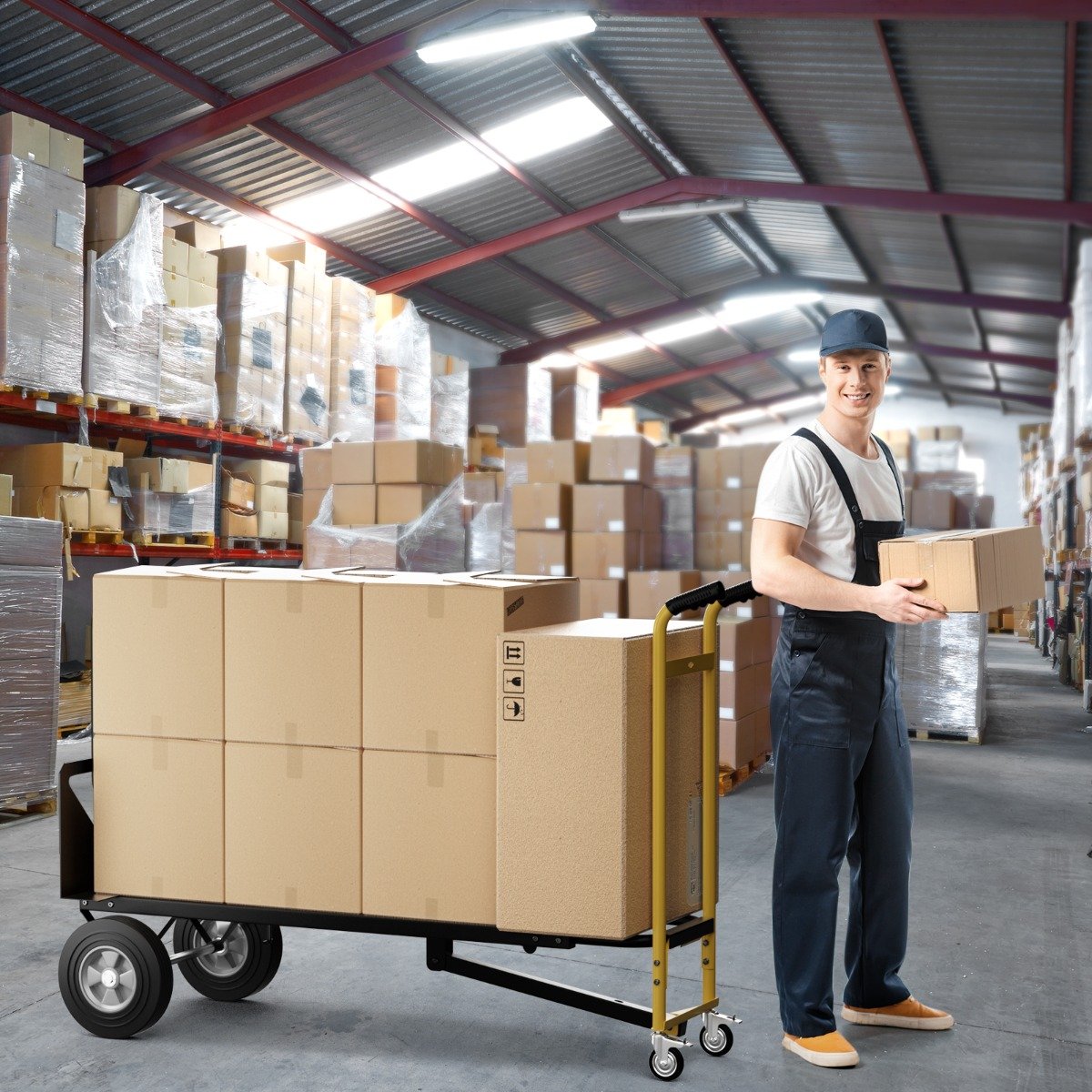 Design conversível 3 em 1: O carrinho de mão conversível pode ser configurado em 3 posições: vertical, para maior flexibilidade de uso; inclinado para trás, para facilitar o transporte; e totalmente plano, para maior capacidade de carga. Esse design exclusivo foi pensado para uso dinâmico em qualquer situação de movimentação ou transporte. Capacidade de carga ultrarresistente: Construído com estrutura metálica de alta resistência, o carrinho de mão suporta múltiplos trabalhos com cargas pesadas e uso prolongado. A capacidade de carga vertical é de 363 kg (800 lbs) e a capacidade de carga da placa é de até 454 kg (1000 lbs). Rolamento suave e estável: O carrinho de mão possui um design com 4 rodas, sendo 2 delas rodas grandes e robustas de 10 polegadas, garantindo movimentação fácil em diferentes modos. Além disso, as outras 2 rodas são rodas universais com trava, facilitando a frenagem do carrinho. Design amigável ao usuário: Vários detalhes bem projetados melhoram sua experiência de uso. A alça antiderrapante é fácil de segurar. E o carrinho de mão pode ser travado firmemente em um modo com a alavanca de fixação e a trava de segurança. Uso versátil: O carrinho também vem com uma corda de amarração funcional para melhor fixação. Isso trará praticidade e economizará esforço em diversas ocasiões, como em armazéns, garagens, oficinas, mudanças e muito mais.