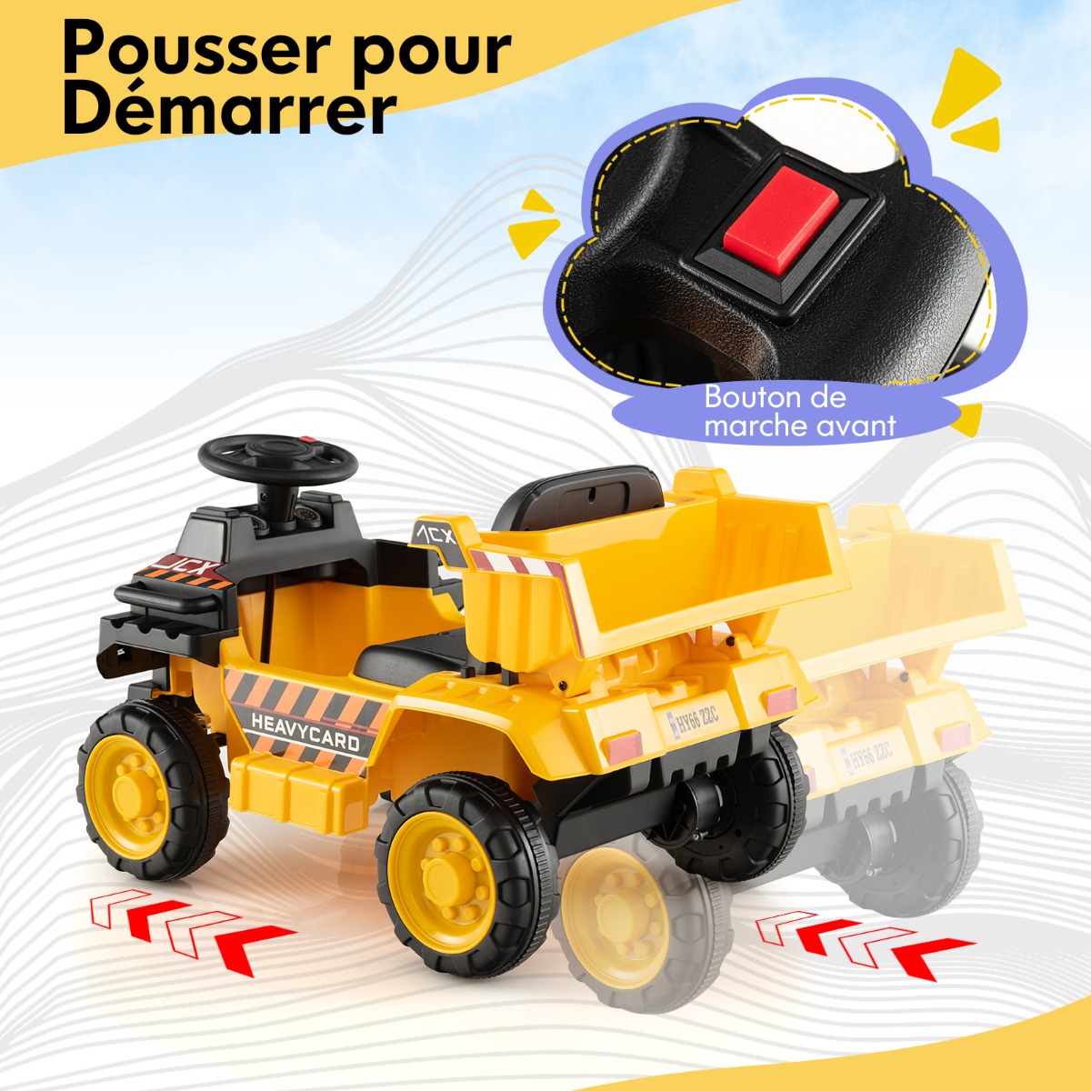 Caminhão basculante infantil 6V com capacete de segurança, velocidade máxima de 2,5 km/h, para crianças a partir de 18 meses, cor amarela.