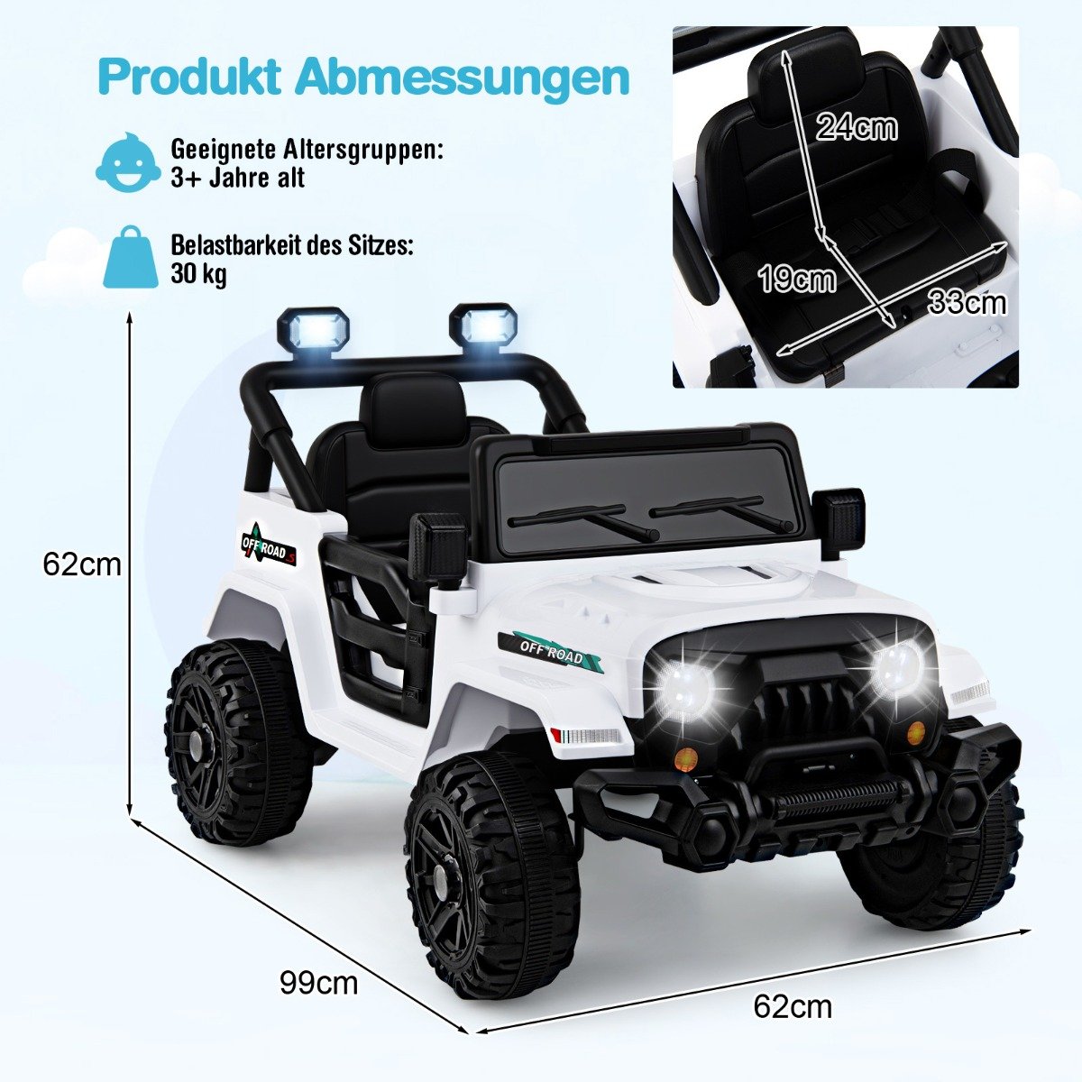 Caminhão elétrico com controle remoto, rodas off-road e luzes de LED. Brinquedo branco.