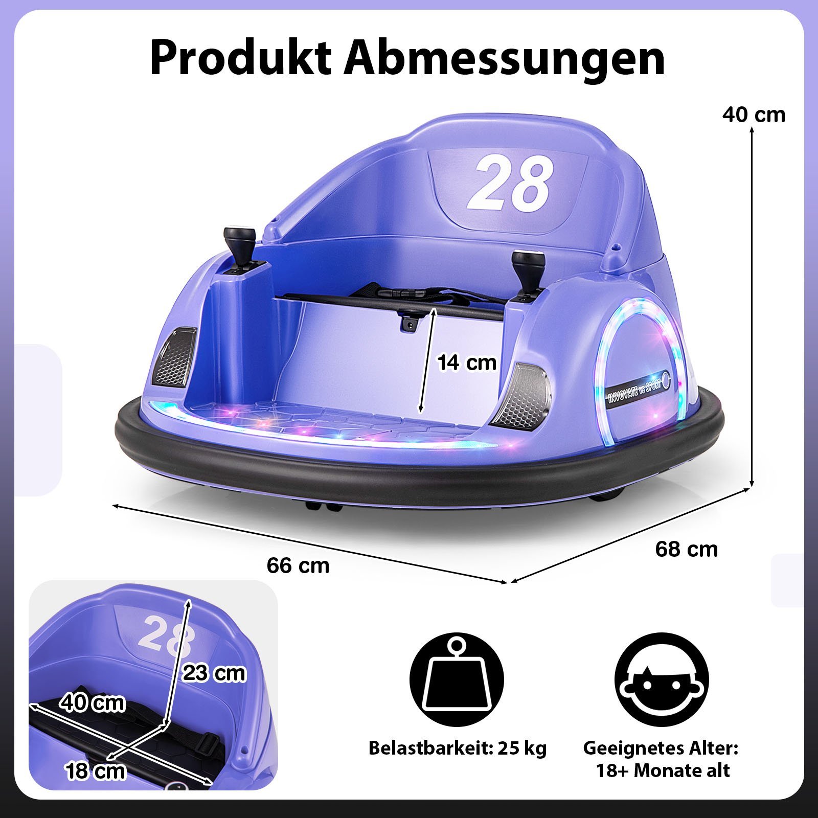 Projetado com música e luzes atraentes, este carrinho de choque elétrico oferece diversão sem fim com rotação de 360 ​​graus e escudos de proteção duráveis. O painel de mídia funcional, que suporta USB e AUX, também possui indicadores de bateria, controles de volume e uma buzina para maior diversão. Construído com segurança com um cinto de segurança confortável e um sistema de partida suave, o carrinho de choque oferece um ambiente confiável para as crianças aproveitarem a diversão da corrida. Os controles remotos e manuais facilitam dirigir para frente e para trás, virar à esquerda e à direita e parar. Atributos: Gire e bata para se divertir: Prepare-se para solavancos e giros! Com duas rodas motrizes e duas rodas universais, este carrinho de choque permite que seu pequeno piloto gire 360 ​​graus enquanto salta sobre obstáculos. Hora de iluminar a diversão interna e externa com passeios emocionantes e risadas alegres! Desempenho fantástico: Ilumine a diversão com luzes piscantes deslumbrantes e música deliciosa! O carrinho de choque possui um painel de controle com portas USB e AUX, e você também pode conectá-lo sem fio para música. Além disso, os motores duplos de 25 W e a bateria recarregável de 12 V 4,5 AH garantem um tempo de brincadeira prolongado. Opções de controle duplo: Este carro elétrico giratório oferece dois modos de controle: controle remoto dos pais com 3 configurações de velocidade (0,75-1,25 MPH) e controle manual por crianças. É perfeito para ensinar jovens motoristas a dirigir ou dar aos pais tranquilidade sobre um passeio seguro. Brincadeira despreocupada: Projetado com um cinto de segurança confortável e um para-choque macio, este carrinho de bate-bate garante que a brincadeira seja tão segura quanto divertida. Além disso, a partida suave e a velocidade certa garantem segurança adicional. Ideia de presente ideal: Procurando um presente impressionante para crianças de 18 meses ou mais? Não procure mais! Este carrinho de bate-bate elétrico impressiona com seu design moderno e recursos lúdicos, tornando-o uma escolha sensacional para aniversários, feriados ou qualquer ocasião especial. Características: Equipado com 2 rodas motrizes e 2 rodas universais para movimentos flexíveis Rodas de PP e PVC para uso interno e externo O efeito de luz colorida cria uma atmosfera de corrida Aproveite as funções de música com a porta USB/AUX ou conexão sem fio Carregue convenientemente pela porta de carregamento de 8 a 12 horas Ajuste de 3 velocidades com o controle remoto Cinto de segurança e amortecedor anticolisão para alta segurança Função de partida lenta para segurança das crianças