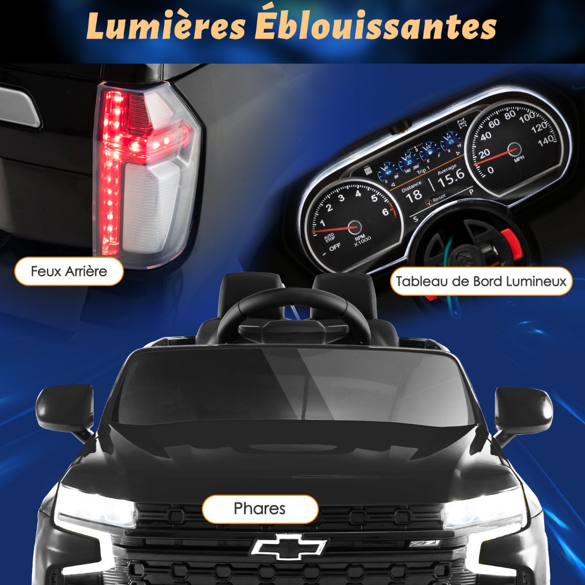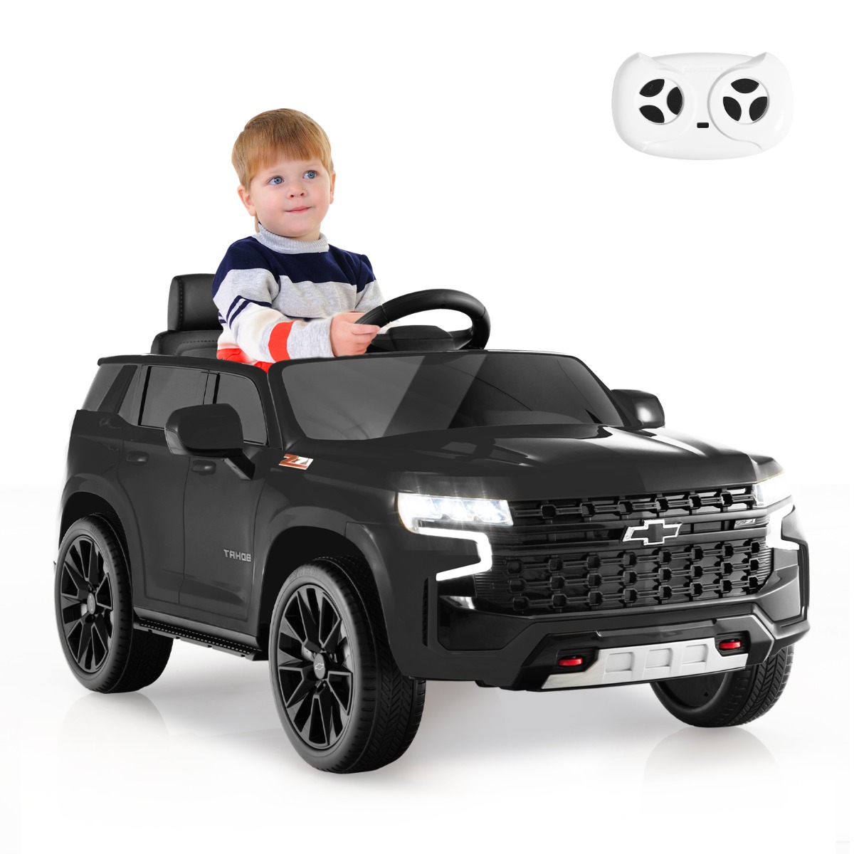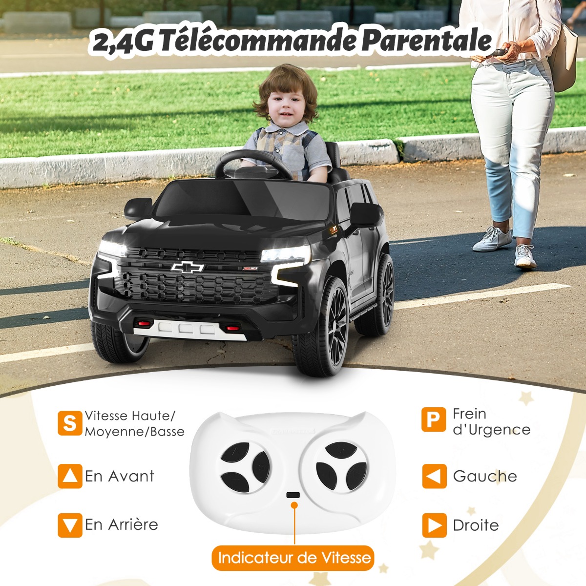 Carrinho elétrico infantil Chevrolet com controle remoto 2.4G, suspensão, luzes e música. Cor preta.Carrinho elétrico infantil Chevrolet com controle remoto 2.4G, suspensão, luzes e música. Cor preta.
