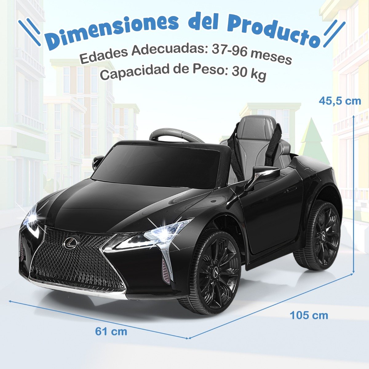Carrinho elétrico infantil Lexus LC500 preto com controle remoto 2.4G, luzes de LED e música.