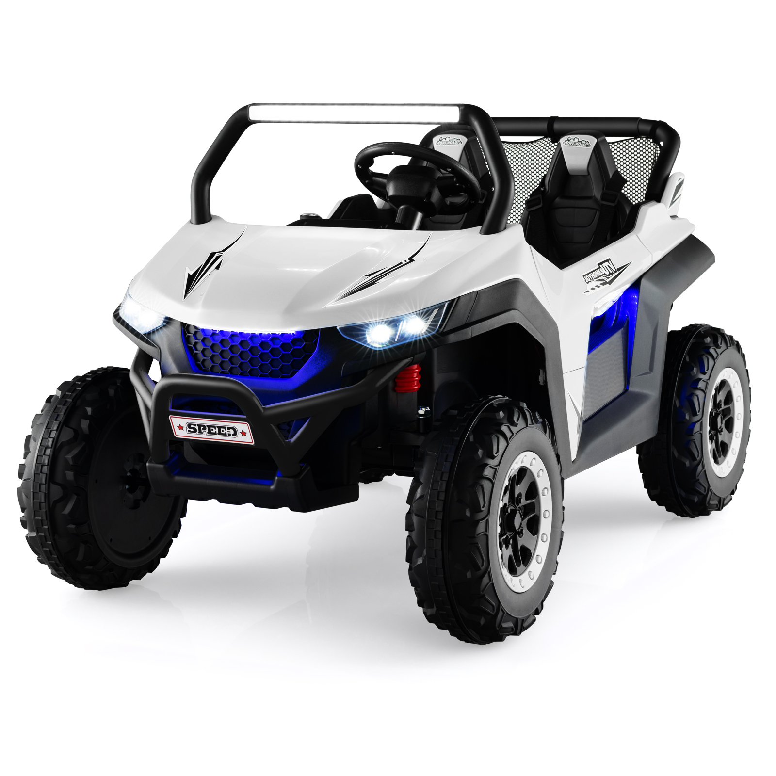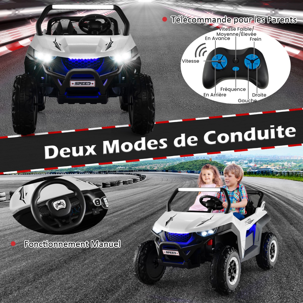 Procurando um presente fantástico para surpreender seus pequenos? Nosso caminhão de passeio de 12 V não vai te decepcionar! Os faróis brilhantes combinados com luzes ambiente deslumbrantes criam um veículo off-road atraente, e não há dúvida de que seus filhos vão adorar. O design amplo de 2 lugares permite que 2 crianças aproveitem a direção juntas. O que as crianças precisam fazer é ligar o interruptor de energia, escolher a velocidade alta/baixa, bem como a direção para frente/ré, e então pisar no pedal. A tecnologia de partida lenta e as rodas resistentes ao desgaste com suspensão de mola garantem uma viagem suave e estável em vários terrenos. Além disso, a música integrada e o som animado da buzina não deixarão seus filhos entediados enquanto dirigem. Você também pode inserir seu próprio pen drive USB, conectar o carro ao seu celular para tocar música e pressionar o botão FM para ouvir rádio. Atributos: 【Carro de 2 lugares com segurança confiável】Existem 2 assentos espaçosos com capacidade de carga de 130 kg para 2 crianças compartilharem a diversão de dirigir juntas, realizando o dobro de alegria em um carro. Cada assento é equipado com um cinto de segurança de 3 pontos para proteger a segurança da criança. Além disso, as portas de abertura com travas permitem que as crianças entrem e saiam facilmente do carro. 【Experiência de direção realista】Projetado com faróis brilhantes, lâmpadas de atmosfera exclusivas e legais, o carro de brinquedo elétrico realista certamente atrairá a atenção das crianças à primeira vista. Além disso, partida com um botão, alta/baixa velocidade e direção para frente/trás, volante flexível com buzina vívida oferecem às crianças uma experiência de direção realista fabulosa. 【2 modos de direção com partida suave】Além da operação manual pelas próprias crianças, o veículo off-road alimentado por bateria de 12 V também vem com um controle remoto 2.4G. Assim, os pais podem controlar a velocidade e a direção do veículo para uma operação segura. Melhor ainda, esses dois modos de direção apresentam uma partida suave que protege as crianças de impactos repentinos. 【Rodas resistentes ao desgaste para vários terrenos】Equipado com rodas resistentes ao desgaste e antiderrapantes, o veículo elétrico off-road permite que as crianças andem em vários terrenos, como estradas de asfalto, estradas de tijolos e calçadões. Além disso, as molas de suspensão nas 4 rodas minimizam efetivamente choques e solavancos, garantindo um passeio estável. 【Múltiplas funções alegres】O veículo off-road elétrico oferece às crianças um tempo de brincadeira muito longo quando totalmente carregado. O painel multimídia multifuncional exibirá a carga da bateria. E há várias músicas integradas para animar seus filhos. A porta USB, a tecnologia sem fio e o rádio tornam mais fontes de áudio disponíveis. Além disso, as crianças podem colocar seus brinquedos e lanches na bolsa de armazenamento traseira. Características: 2 assentos largos podem acomodar 2 crianças simultaneamente Pode suportar até 59 kg, adequado para crianças de 3 a 8 anos Cintos de segurança multiponto e portas com trava para maior segurança Farol brilhante e luz ambiente fria para uma aparência fria e atraente 3 opções de velocidade ajustáveis no modo de controle remoto e 2 no modo manual Interruptor de mudança de marchas e volante flexível para mudar de direção A tecnologia de partida lenta evita perigos causados por aceleração repentina 4 rodas premium são resistentes ao desgaste, antiderrapantes e sem inflação O sistema de suspensão de mola ajuda a reduzir solavancos em estradas irregulares Adequado para estradas de asfalto, estradas de cimento, parques, estradas de tijolos, etc. A bateria potente de 12 V oferece às crianças mais tempo de brincadeira Música integrada e som potente proporcionam diversão sem fim às crianças Porta USB, botão FM e conexão sem fio para muitos recursos Grande bolsa de malha para armazenar brinquedos, lanches e garrafas de água das crianças