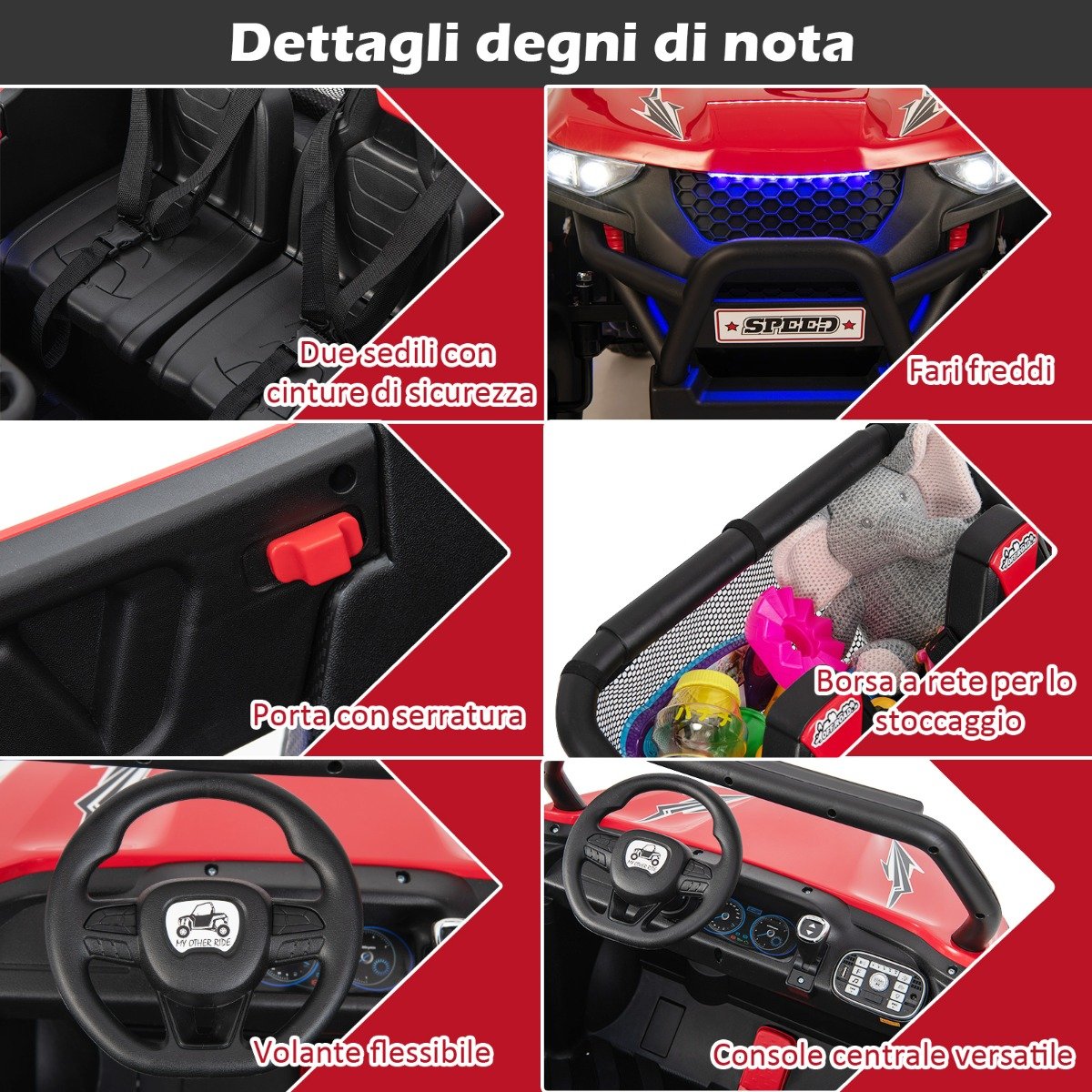 Você está procurando um ótimo presente para surpreender seus pequenos? Nosso veículo off-road para crianças não vai te decepcionar! Os faróis brilhantes combinados com luzes ambiente incríveis criam um UTV atraente e não há dúvida de que seus filhos vão adorar. O design amplo de 2 lugares permite que 2 crianças andem juntas. Tudo o que as crianças precisam fazer é ligar o botão liga/desliga, escolher a velocidade alta/baixa e a direção para frente/trás e, em seguida, pressionar o pedal. A tecnologia de partida lenta e as rodas resistentes ao desgaste com suspensão por mola garantem uma direção suave e estável em diferentes superfícies. Além disso, a música integrada e o som animado da buzina garantem que seus filhos não fiquem entediados enquanto dirigem. Você também pode conectar seu próprio pendrive e conectar o carro ao seu celular para tocar música e pressionar o botão FM para ouvir rádio. Se você está preocupado que seu filho seja muito pequeno para dirigir sozinho, você pode controlar facilmente o veículo elétrico com o controle remoto 2.4G. Atributos: Veículo off-road de 2 lugares com segurança confiável: Existem 2 assentos espaçosos com capacidade de carga de 59 kg para 2 crianças compartilharem a diversão de dirigir juntas e realizarem o dobro da alegria em um carro. Cada assento tem um cinto de segurança de 3 pontos para garantir a segurança da criança. Além disso, as portas de abertura com travas permitem que as crianças entrem e saiam convenientemente. Experiência de direção realista: Projetado com faróis brilhantes e lâmpadas de ambiente exclusivas e legais, o carro de brinquedo elétrico realista atrairá a atenção das crianças à primeira vista. Além disso, a partida de um botão, alta/baixa velocidade e direção para frente/trás e o volante flexível com buzina animada proporcionam às crianças uma experiência de direção realista fabulosa. 2 modos de direção com partida suave: além da operação manual pelas próprias crianças, o UTV alimentado por bateria de 12 V também vem com um controle remoto 2.4G, permitindo que os pais controlem a velocidade e a direção do veículo para uso seguro. Melhor ainda, ambos os modos de direção apresentam uma partida suave que protege as crianças de impactos repentinos. Rodas resistentes ao desgaste para diversas superfícies: Equipado com rodas resistentes ao desgaste e antiderrapantes, o veículo elétrico todo-terreno permite que as crianças andem em diversas superfícies, como estradas de asfalto, estradas de tijolos e calçadões. Além disso, as molas de suspensão nas 4 rodas minimizam efetivamente choques e solavancos, garantindo uma viagem suave. Múltiplas funções divertidas: O carro elétrico oferece às crianças um tempo de jogo superlongo quando totalmente carregado. O centro de mídia multifuncional exibe a carga da bateria. E há várias músicas integradas para animar seus filhos. Porta USB, tecnologia sem fio e rádio tornam mais fontes de áudio disponíveis. Além disso, as crianças podem guardar seus brinquedos e lanches no bolso de malha traseiro. Características: 2 assentos largos oferecem espaço para 2 crianças ao mesmo tempo Capacidade de carga de até 59 kg, adequado para crianças de 3 a 8 anos Cintos de segurança de 3 pontos e portas com trava para maior segurança Farol brilhante e luz ambiente fria para um visual moderno e atraente 3 opções de velocidade ajustáveis no modo de controle remoto e 2 no modo manual Alavanca de câmbio e volante flexível para mudar de direção A tecnologia de partida lenta evita perigos causados por aceleração repentina 4 rodas premium são resistentes ao desgaste, antiderrapantes e não perdem ar O sistema de suspensão de mola ajuda a reduzir solavancos na estrada Adequado para estradas de asfalto, estradas de cimento, calçadões, estradas de tijolos, etc. A bateria potente de 12 V oferece às crianças mais tempo de jogo Música integrada e som alto trazem diversão sem fim para as crianças Porta USB, botão FM e conexão sem fio para vários recursos Grande bolso de malha para armazenar brinquedos infantis, lanches e garrafas de água