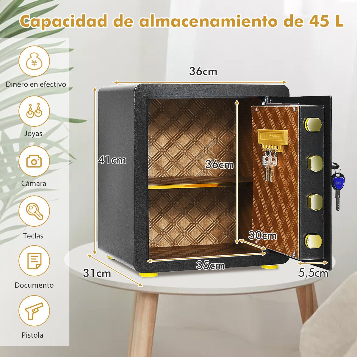 Proteja sua propriedade com nosso cofre confiável! Feito de aço estrutural de carbono de alta qualidade e parafusos de travamento sólidos, o cofre oferece proteção superior e vida útil duradoura. O cofre também é equipado com um sistema de alarme sensível que emite um sinal sonoro e pisca para alertar após tentativas incorretas de inserir o código ou vibração violenta. Além disso, a excelente tecnologia anti-espionagem adiciona segurança extra. Portanto, você pode armazenar com confiança seus itens preciosos, incluindo dinheiro, relógios, passaportes e produtos eletrônicos neste cofre. Além disso, o prático teclado digital, as chaves mestras, as chaves de emergência e uma interface Android Micro-USB permitem que você abra o cofre, não importa se as baterias acabam ou se você esquece a senha. Além disso, com os 2 furos pré-perfurados e os 2 parafusos de expansão, você também pode instalar o cofre na parede ou prateleira para aumentar a segurança. Ponto de bala: Construção de aço segura e durável: Feito de aço estrutural de carbono resistente a arrombamentos, este cofre garante grande robustez e durabilidade duradoura. Além disso, o cofre de segurança também possui 4 parafusos de porta sólida e um painel de porta espesso para oferecer excelente desempenho seguro. Sistema de alarme sensível e tecnologia anti-espionagem: Nosso cofre de segurança é equipado com sistema de alarme inteligente que será ativado com bipe e luz vermelha piscando após 3 entradas de código erradas continuamente ou vibração violenta. Além disso, vale a pena mencionar que a tecnologia anti-espionagem permite que você insira qualquer número antes e depois do código correto para evitar adivinhação de senha. Três maneiras de abrir: Este cofre eletrônico vem com 2 chaves mestras, 2 chaves de emergência e uma interface Android Micro-USB. Para uso diário, você pode inserir sua senha pessoal e girar a chave mestra. Se você esquecer o cabo, pode usar a chave mestra mais a chave de emergência. Quando as baterias acabarem, você precisará usar sua própria carga portátil, senha e a chave mestra. Grande capacidade de armazenamento: O cofre de 45L pés é capaz de acomodar seus vários objetos de valor, como dinheiro, joias, passaporte e câmeras. Além disso, a prateleira interna pode ser removida para ampliar o espaço de armazenamento e acomodar itens grandes. Melhor ainda, a superfície interna é totalmente revestida em couro para proteger seus pertences do desgaste. Instalação prática: Forneceremos 2 parafusos de expansão para que você possa fixar o cofre na parede do seu armário, prateleira ou guarda-roupa. Além disso, os apoios antiderrapantes para os pés proporcionam grande estabilidade. Este cofre compacto e seguro é perfeito para o escritório, casa, caixa de shopping, etc. Características: Construção de aço resistente e sólido para garantir a segurança 3 vezes de senha incorreta ou vibração violenta podem ativar o sistema de alerta Tecnologia anti-espionagem evita a divulgação de senha A luz indicadora piscará para lembrá-lo de bateria fraca Amplo espaço para proteger suas joias, documentos, passaportes e dinheiro Destacar a prateleira para armazenar itens grandes e longos Superfície coberta de couro para evitar que joias e outros itens delicados arranhem Fácil de redefinir a senha pressionando o botão verde dentro da caixa Duas chaves de emergência podem ser usadas para abrir o cofre se você esquecer a senha Interface Android Micro-USB para conectar o carregador portátil (não incluído) se as baterias acabarem Furos pré-perfurados e parafusos de expansão para montagem na parede para melhorar a segurança Adequado para casa, escritório, hotel, shopping, etc Especificação: Cor: Preto Material: Aço Estrutural de Carbono Dimensão total: 36 cm x 31 cm x 41 cm (C x L x H) Tamanho interno: 30 cm x 30 cm x 36 cm (C x L x A) Peso líquido: 13 kg O pacote inclui: 1 x cofre elétrico 2 x chaves principais 2 x chaves de emergência 2 x parafusos de expansão 1 x instruções