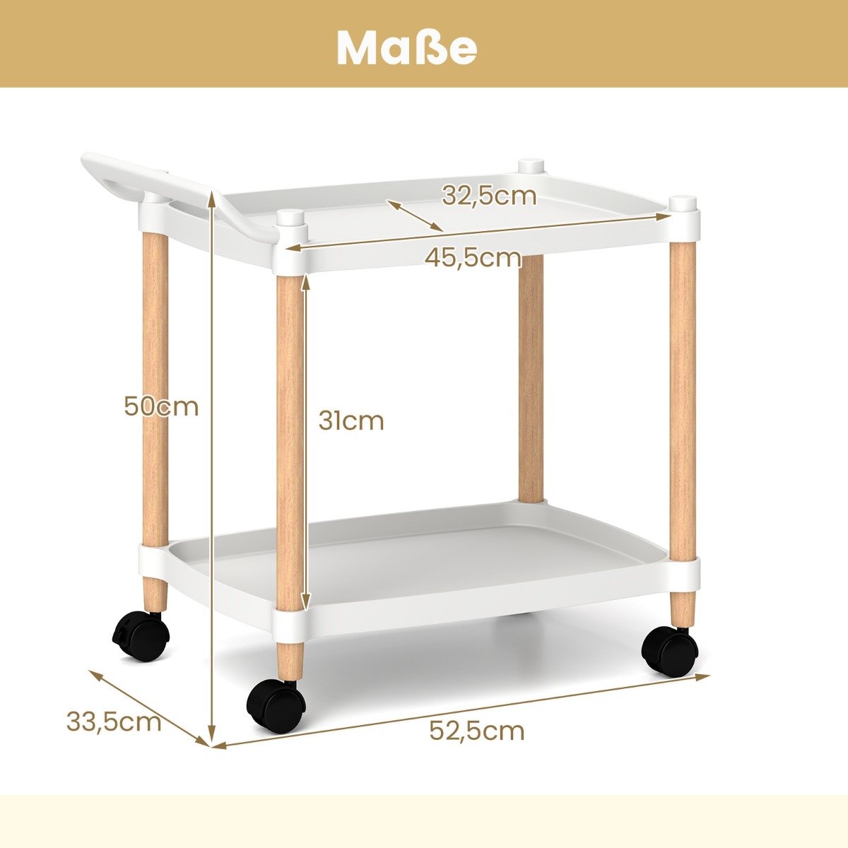 O carrinho é feito de PP de alta qualidade e madeira de faia maciça, garantindo durabilidade e suporte confiável. Com 2 prateleiras abertas para fácil acesso, é ideal para armazenar lanches, bebidas, artigos diversos, livros e muito mais. A manobrabilidade é fácil graças às rodas universais suaves e à alça de empurrar conveniente, ideal para movimentos sem esforço. Seja na cozinha, banheiro, sala de estar ou escritório, o versátil carrinho com rodas se adapta às suas necessidades. Seu design compacto o torna a escolha ideal para atualizar o espaço de armazenamento em espaços apertados. Atributos: Solução de armazenamento conveniente: Nosso carrinho com rodas possui 2 prateleiras espaçosas, ideais para lanches, bebidas, livros e materiais de escritório. O design da prateleira aberta permite fácil acesso, enquanto as bordas elevadas garantem que seus itens permaneçam seguros. Materiais selecionados: Feito de PP de alta qualidade e madeira de faia maciça, o carrinho utilitário oferece durabilidade e resistência duradouras. Os materiais resistentes garantem uma combinação de funcionalidade e apelo estético, tornando-o uma adição confiável para sua casa ou escritório. Mobilidade sem esforço: Com uma alça conveniente e 4 rodízios universais, nosso carrinho com rodas garante fácil manobrabilidade em várias superfícies. Ele também possui duas rodas com trava para manter o carrinho firmemente no lugar quando necessário. Carrinho com rodas versátil: Este carrinho versátil se adapta perfeitamente a qualquer cômodo, seja para atualizar seu escritório em casa, sala de estar, cozinha ou banheiro. Seu design elegante destaca seu espaço de convivência e oferece amplo espaço de armazenamento sem abrir mão do estilo. Tamanho compacto e fácil montagem: Com dimensões totais de 52,5 x 33,5 x 50 cm (C x L x A), o carrinho com rodas de 2 níveis é uma solução de armazenamento que economiza espaço e se encaixa perfeitamente em espaços apertados. Além disso, o processo de montagem descomplicado significa que o carrinho está pronto para uso em apenas alguns minutos. Características: Carrinho de armazenamento de 2 níveis para armazenamento de vários itens com economia de espaço. Suportes de madeira de faia maciça fornecem suporte e estabilidade fortes. Material PP de alta qualidade para longa durabilidade. Alça prática facilita a manobra do carrinho. Rodízios giratórios de 360° (2 com freios) permitem movimento sem esforço. Bordas elevadas evitam que os itens caiam. O tamanho compacto o torna ideal para espaços pequenos. O carrinho versátil pode ser usado na sala de estar, escritório, banheiro ou cozinha.