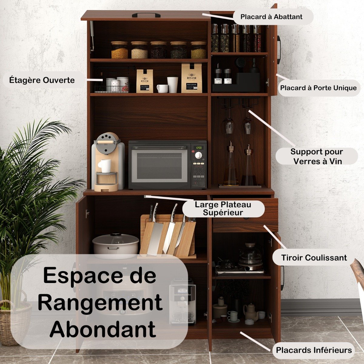 Com 3 prateleiras ajustáveis nos armários, este aparador organiza tudo, desde utensílios de cozinha a potes de especiarias. A combinação de um armário suspenso, uma prateleira aberta, uma bancada ampla e uma gaveta extraível mantém os seus utensílios de cozinha perfeitamente organizados. Emparelhado com o suporte para taças, é uma solução elegante para manter os copos acessíveis e vem equipado com uma estação de carregamento para maior conveniência. A segurança é levada em consideração com kits anti-tombamento, garantindo que o armário permaneça estável e seguro. Atributos: 【Espaço de armazenamento abundante】Este aparador possui um armário suspenso e uma prateleira aberta para fácil acesso, combinados com uma ampla bancada para organizar os eletrodomésticos da cozinha. O suporte para taças de vinho embutido protege as suas taças. Além disso, a gaveta conveniente, o armário de 2 portas e o armário de uma porta fornecem amplo armazenamento para utensílios de cozinha e talheres. 【Solução de Armazenamento Flexível】O armário superior possui uma prateleira ajustável em 3 posições, enquanto os armários inferiores possuem prateleiras ajustáveis em 5 posições, dando a você a flexibilidade de personalizar o armazenamento de acordo com suas necessidades. 【Estação de Carregamento Conveniente】Mantenha-se conectado enquanto cozinha ou se diverte com uma estação de carregamento embutida neste aparador independente. Há 2 tomadas, 1 porta USB e 1 porta Tipo C para manter os dispositivos ligados e acessíveis. 【Uso Seguro e Estável】Projetado para estabilidade e segurança, o armário de armazenamento de cozinha inclui 2 kits antitombamento para fixá-lo com segurança na parede, tornando-o um complemento confiável para casas com crianças ou animais de estimação. Além disso, a base espessa adiciona estabilidade extra. 【Design Estético】Este moderno armário de micro-ondas complementa qualquer estilo de casa. Você também pode usá-lo como um bufê na sala de jantar, um armário na sua cozinha ou um organizador de armazenamento na sua sala de estar, aprimorando a estética e proporcionando uso prático.