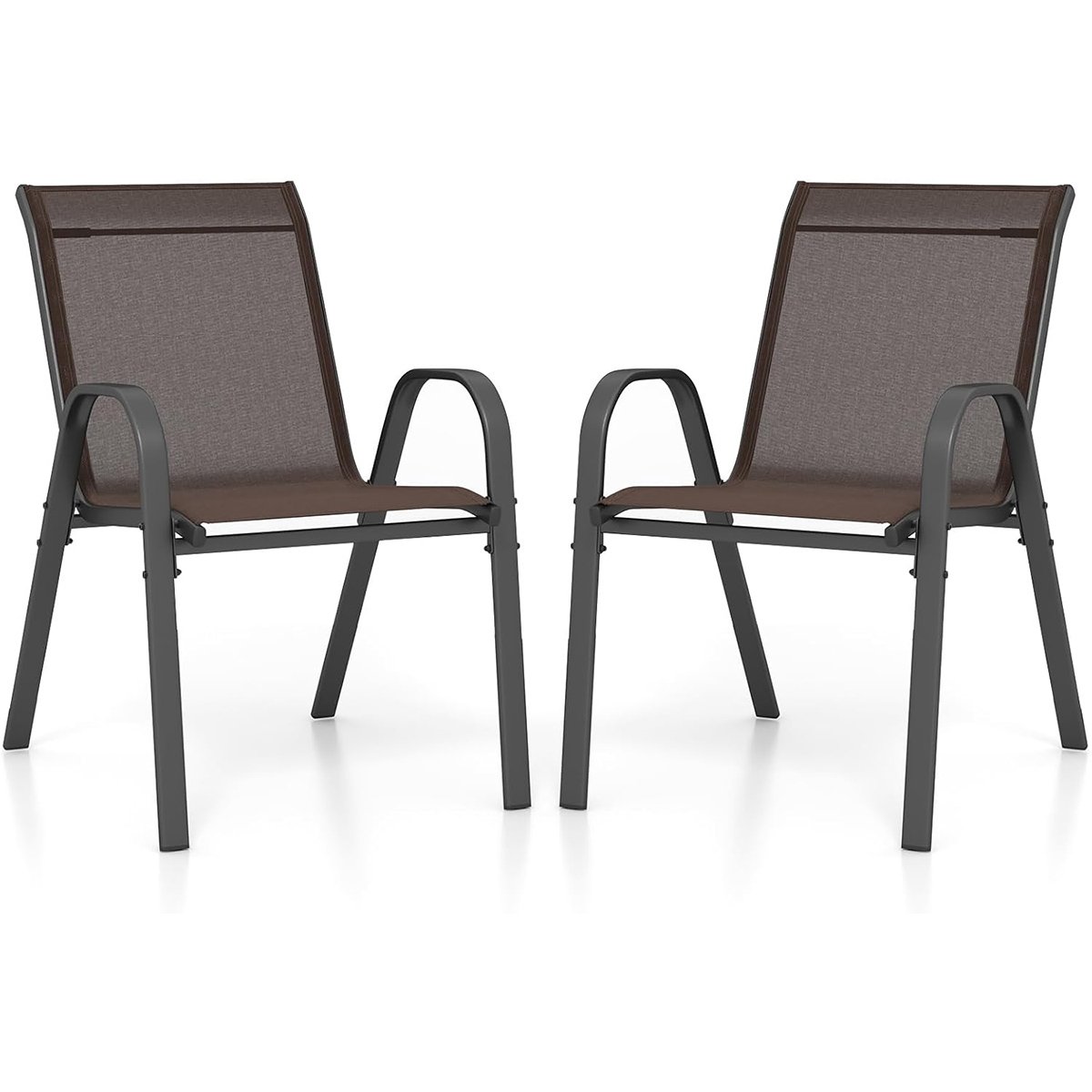 Conjunto de 2 cadeiras de jardim empilháveis em textilene com estrutura metálica, 56 x 70 x 84 cm, cor castanha.