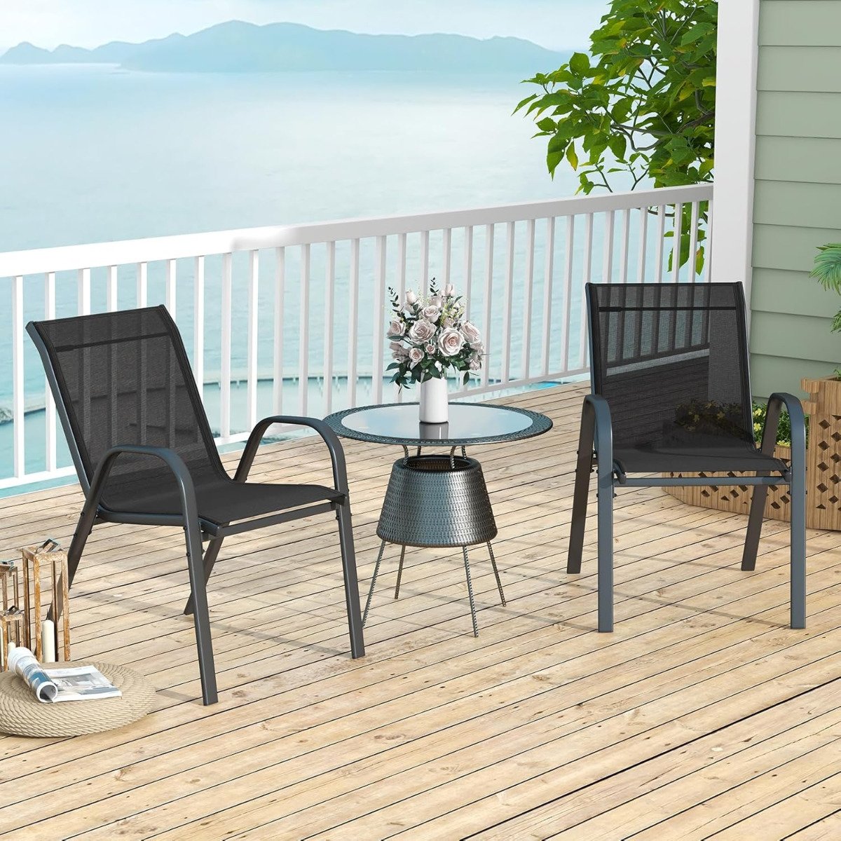 Conjunto de 4 cadeiras de jardim empilháveis ​​em textilene com estrutura metálica, 56 x 70 x 84 cm, pretas.